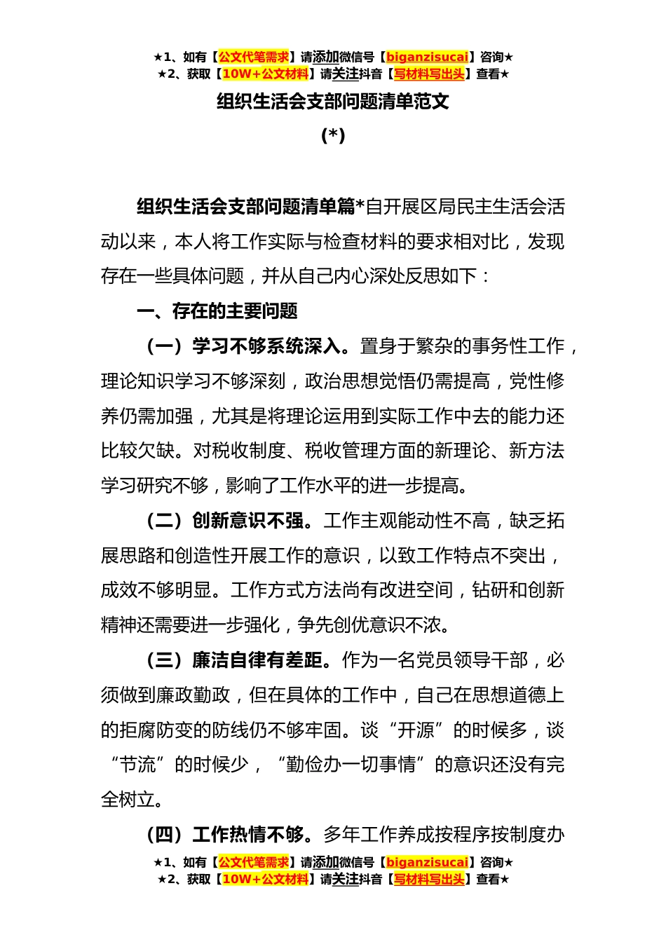 ★1、如有【公文代笔需求】请添加微信号【biganzisucai】咨询★★2、获取【10W+公文材料】请关注抖音【写材料写出头】查看★组织生活会支部问题清单范文(*)组织生活会支部问题清单篇*自开展区局民主生活会活动以来,本人将工作实际与检查材料的要求相对比,发现存在一些具体问题,并从自己内心深处反思如下:一、存在的主要问题(一)学习不够系统深入。置身于繁杂的事务性工作,理论知识学习不够深刻,政治思想觉悟仍需提高,党性修养仍需加强,尤其是将理论运用到实际工作中去的能力还比较欠缺。对税收制度、税收管理方面的新理论、新方法学习研究不够,影响了工作水平的进一步提高。(二)创新意识不强。工作主观能动性不高,缺乏拓展思路和创造性开展工作的意识,以致工作特点不突出,成效不够明显。工作方式...