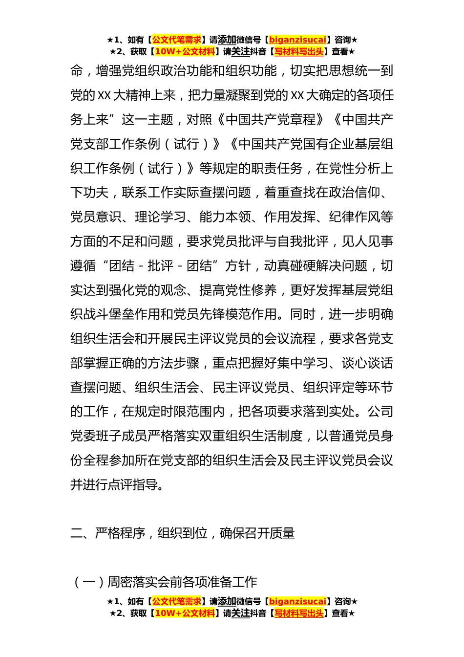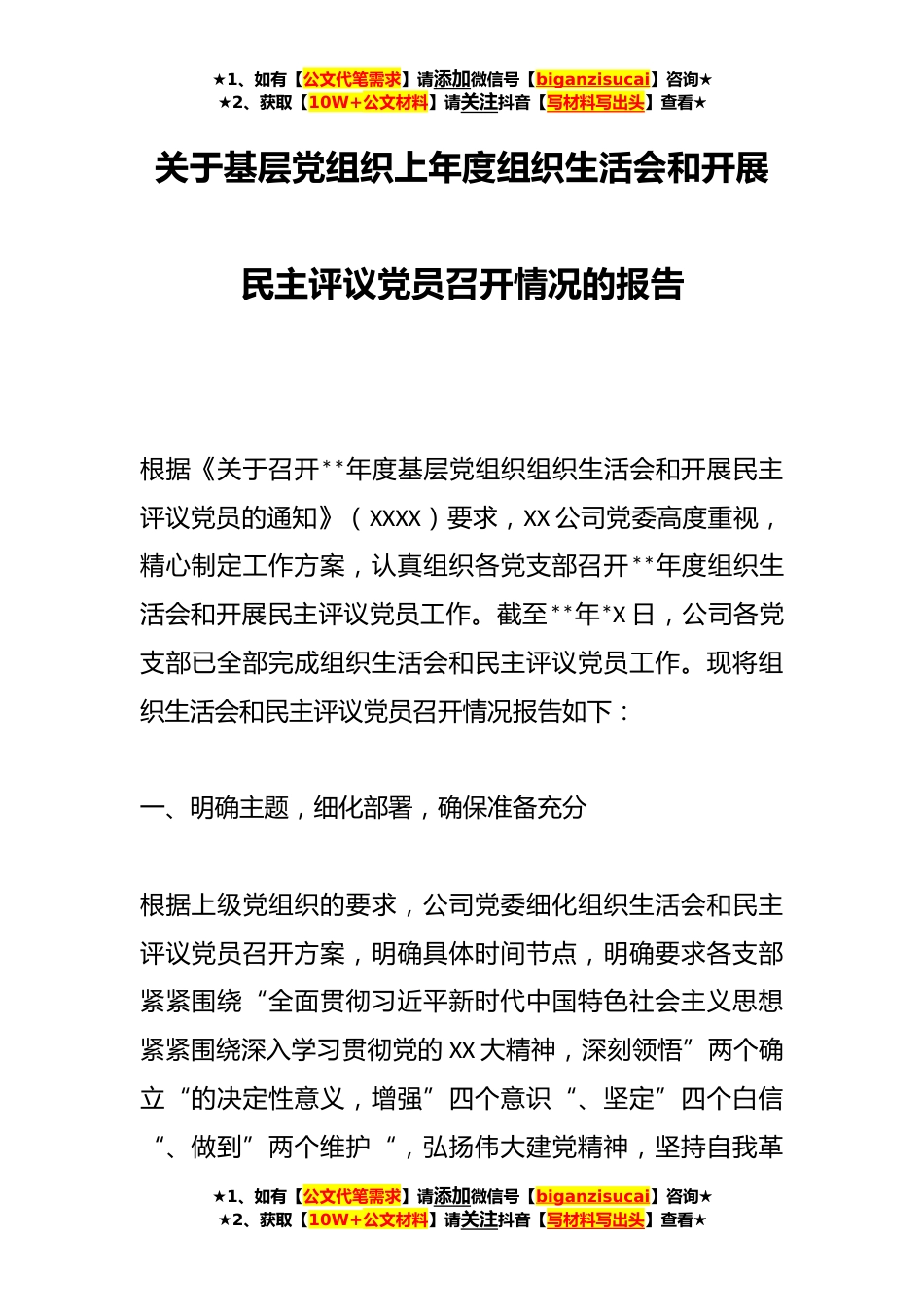 ★1、如有【公文代笔需求】请添加微信号【biganzisucai】咨询★★2、获取【10W+公文材料】请关注抖音【写材料写出头】查看★关于基层党组织上年度组织生活会和开展民主评议党员召开情况的报告根据《关于召开**年度基层党组织组织生活会和开展民主评议党员的通知》(XXXX)要求,XX公司党委高度重视,精心制定工作方案,认真组织各党支部召开**年度组织生活会和开展民主评议党员工作。截至**年*X日,公司各党支部已全部完成组织生活会和民主评议党员工作。现将组织生活会和民主评议党员召开情况报告如下:一、明确主题,细化部署,确保准备充分根据上级党组织的要求,公司党委细化组织生活会和民主评议党员召开方案,明确具体时间节点,明确要求各支部紧紧围绕“全面贯彻习近平新时代中国特色社会主义思想紧紧围绕...