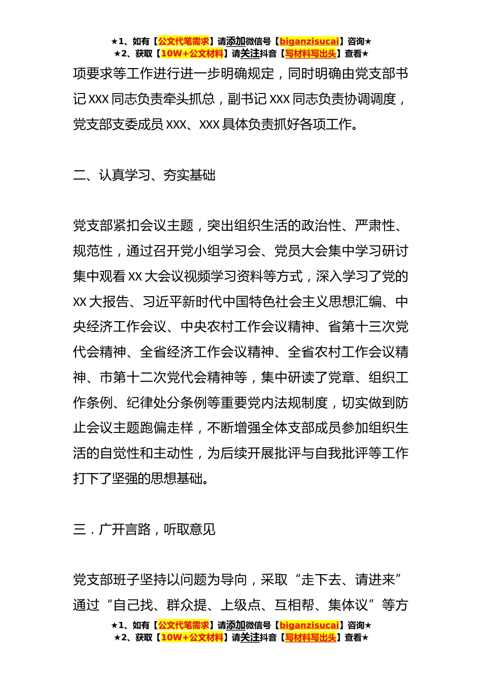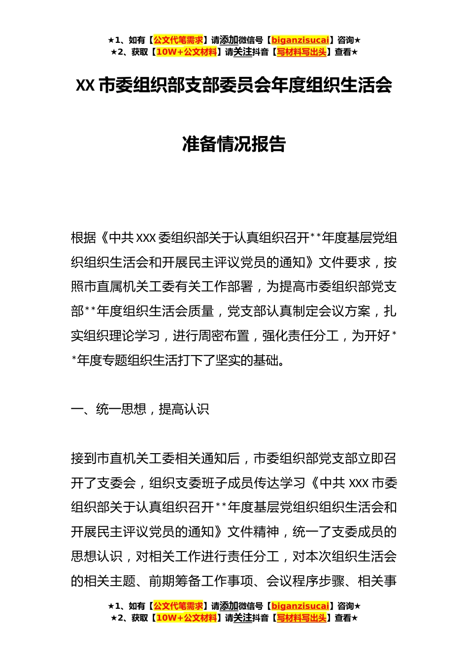 ★1、如有【公文代笔需求】请添加微信号【biganzisucai】咨询★★2、获取【10W+公文材料】请关注抖音【写材料写出头】查看★XX市委组织部支部委员会年度组织生活会准备情况报告根据《中共XXX委组织部关于认真组织召开**年度基层党组织组织生活会和开展民主评议党员的通知》文件要求,按照市直属机关工委有关工作部署,为提高市委组织部党支部**年度组织生活会质量,党支部认真制定会议方案,扎实组织理论学习,进行周密布置,强化责任分工,为开好**年度专题组织生活打下了坚实的基础。一、统一思想,提高认识接到市直机关工委相关通知后,市委组织部党支部立即召开了支委会,组织支委班子成员传达学习《中共XXX市委组织部关于认真组织召开**年度基层党组织组织生活会和开展民主评议党员的通知》文件精神,统一了...
