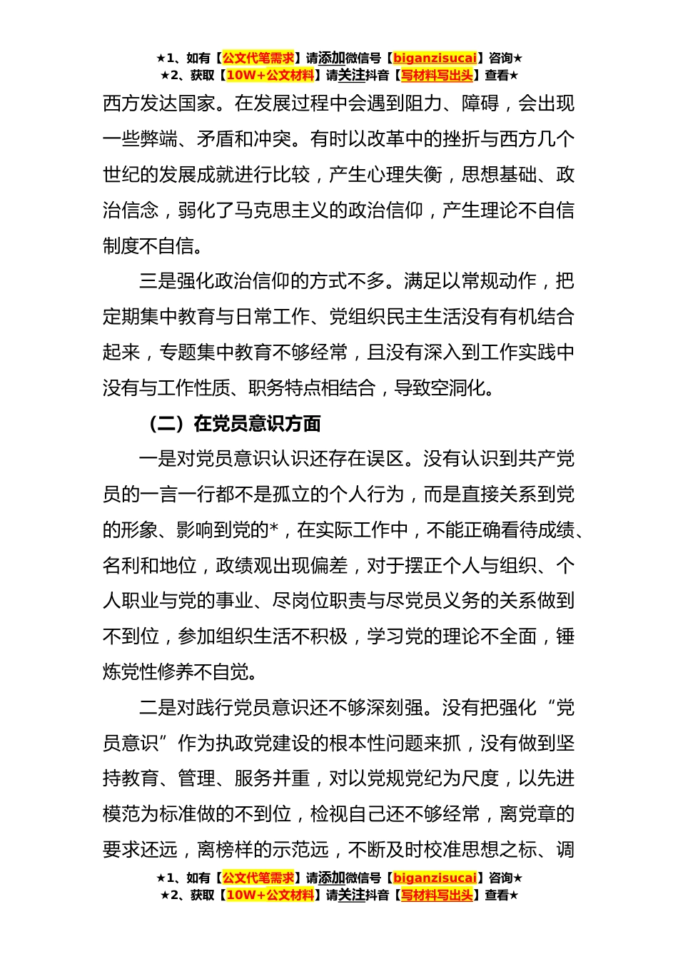 ★1、如有【公文代笔需求】请添加微信号【biganzisucai】咨询★★2、获取【10W+公文材料】请关注抖音【写材料写出头】查看★**年度组织生活会党员个人六个方面对照检查材料按照《关于召开**年度基层党组织组织生活会和开展民主评议党员的通知>》的工作部署,本人深入学习党的二十大精神,认真研读xxx总书记代表二十届中央委员会所作的《高举中国特色社会主义伟大旗帜,为全面建设社会主义现代化国家而团结奋斗》的报告,仔细阅读党章,全面准确领会党的二十大精神,对照六个方面,深入查找问题,进行党性分析,剖析思想根源,开展批评与自我批评进一步明确了努力方向和整改措施。一、查摆的问题(一)在政治信仰方面一是对政治信仰的认识不深刻。当前国际形势云谲波诡、瞬息万变,我们党面临着多方面、多领域的风...