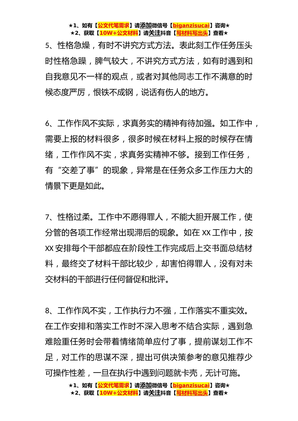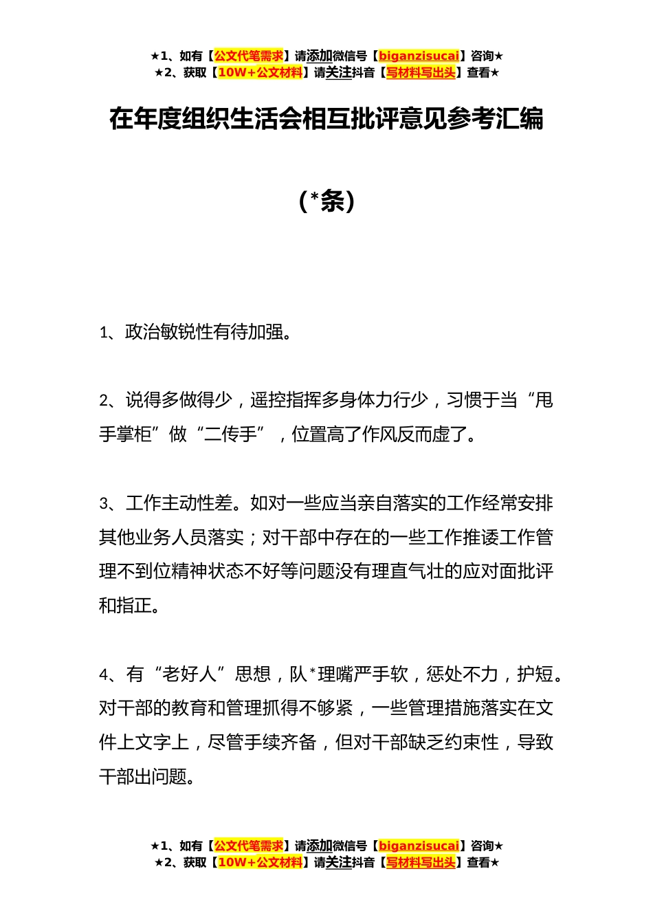 ★1、如有【公文代笔需求】请添加微信号【biganzisucai】咨询★★2、获取【10W+公文材料】请关注抖音【写材料写出头】查看★在年度组织生活会相互批评意见参考汇编(*条)1、政治敏锐性有待加强。2、说得多做得少,遥控指挥多身体力行少,习惯于当“甩手掌柜”做“二传手”,位置高了作风反而虚了。3、工作主动性差。如对一些应当亲自落实的工作经常安排其他业务人员落实;对干部中存在的一些工作推诿工作管理不到位精神状态不好等问题没有理直气壮的应对面批评和指正。4、有“老好人”思想,队*理嘴严手软,惩处不力,护短。对干部的教育和管理抓得不够紧,一些管理措施落实在文件上文字上,尽管手续齐备,但对干部缺乏约束性,导致干部出问题。★1、如有【公文代笔需求】请添加微信号【biganzisucai】咨询★★2...