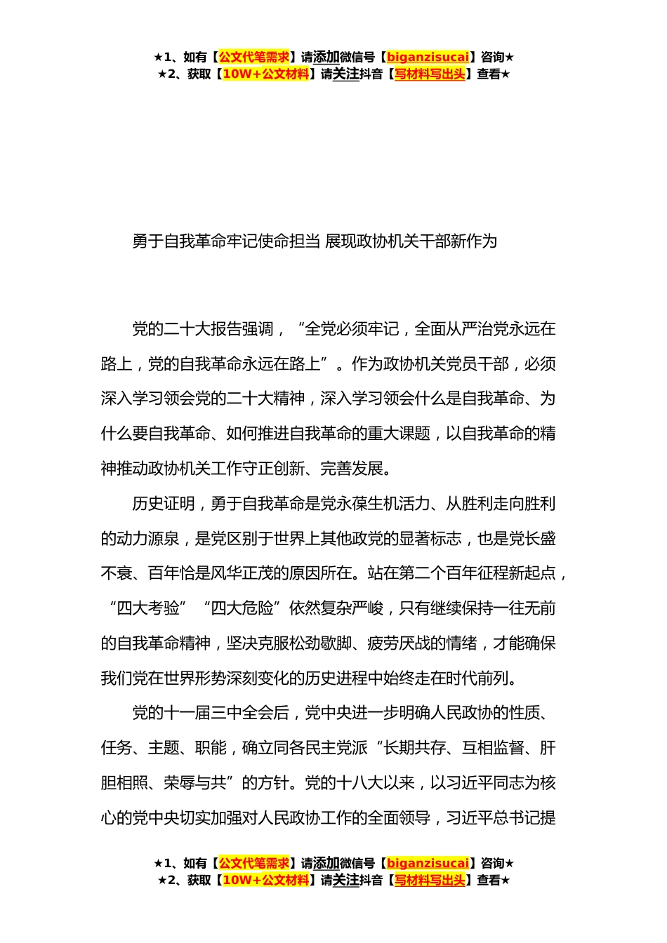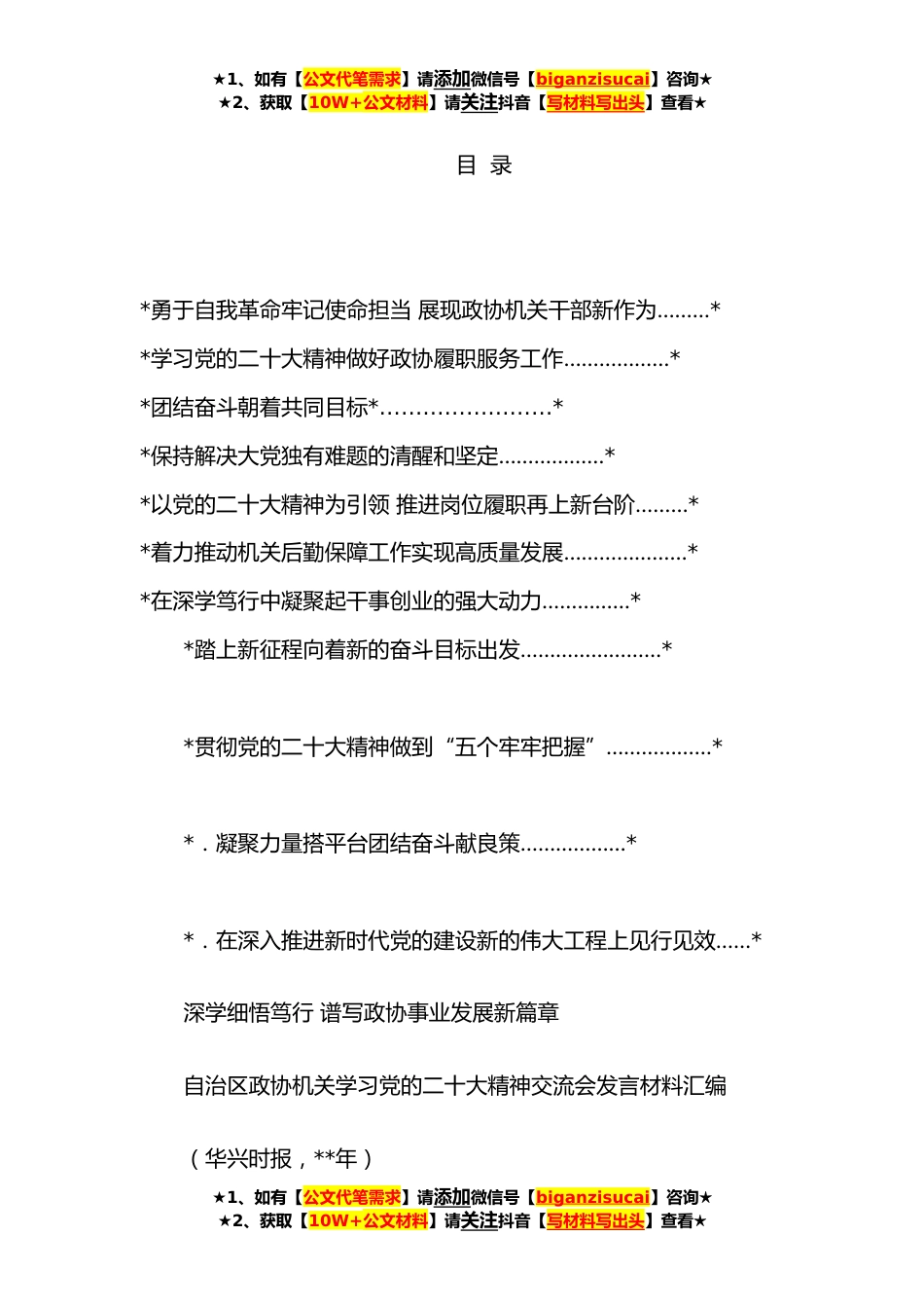 ★1、如有【公文代笔需求】请添加微信号【biganzisucai】咨询★★2、获取【10W+公文材料】请关注抖音【写材料写出头】查看★目录*勇于自我革命牢记使命担当展现政协机关干部新作为………**学习党的二十大精神做好政协履职服务工作………………**团结奋斗朝着共同目标*……………………**保持解决大党独有难题的清醒和坚定………………**以党的二十大精神为引领推进岗位履职再上新台阶………**着力推动机关后勤保障工作实现高质量发展…………………**在深学笃行中凝聚起干事创业的强大动力……………**踏上新征程向着新的奋斗目标出发……………………**贯彻党的二十大精神做到“五个牢牢把握”………………**.凝聚力量搭平台团结奋斗献良策………………**.在深入推进新时代党的建设新的伟大工程上见行见效……*...