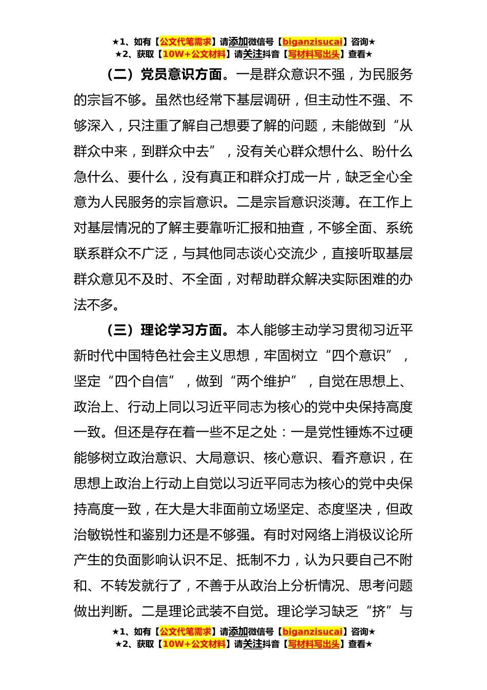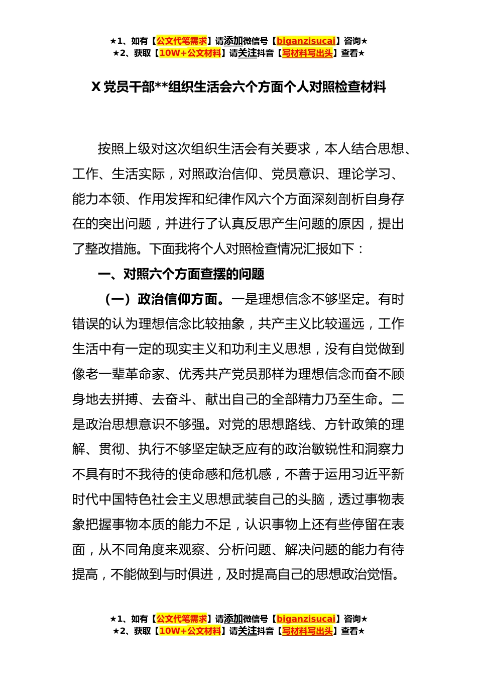 ★1、如有【公文代笔需求】请添加微信号【biganzisucai】咨询★★2、获取【10W+公文材料】请关注抖音【写材料写出头】查看★X党员干部**组织生活会六个方面个人对照检查材料按照上级对这次组织生活会有关要求,本人结合思想、工作、生活实际,对照政治信仰、党员意识、理论学习、能力本领、作用发挥和纪律作风六个方面深刻剖析自身存在的突出问题,并进行了认真反思产生问题的原因,提出了整改措施。下面我将个人对照检查情况汇报如下:一、对照六个方面查摆的问题(一)政治信仰方面。一是理想信念不够坚定。有时错误的认为理想信念比较抽象,共产主义比较遥远,工作生活中有一定的现实主义和功利主义思想,没有自觉做到像老一辈革命家、优秀共产党员那样为理想信念而奋不顾身地去拼搏、去奋斗、献出自己的全部精...