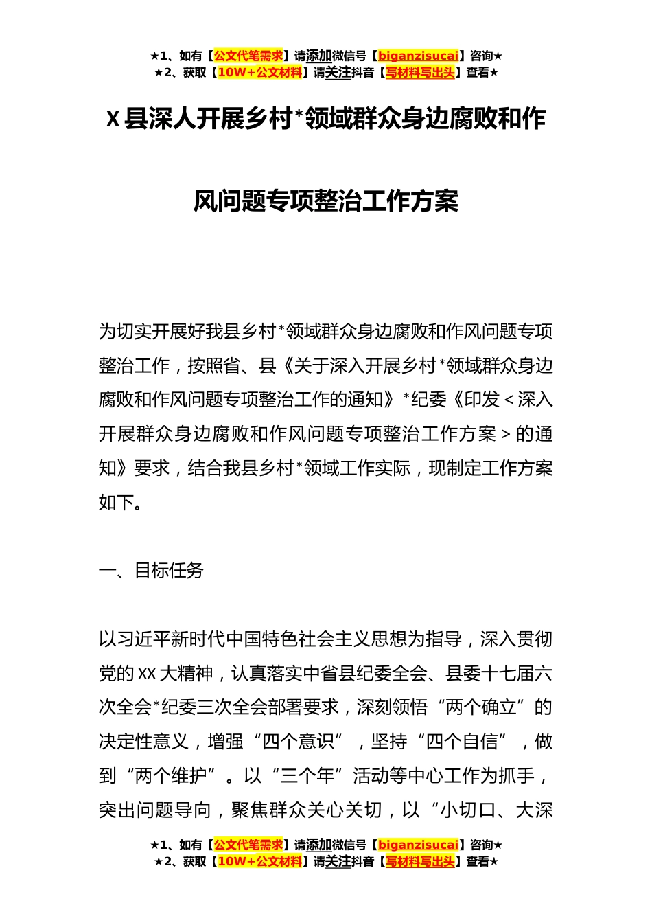 ★1、如有【公文代笔需求】请添加微信号【biganzisucai】咨询★★2、获取【10W+公文材料】请关注抖音【写材料写出头】查看★X县深人开展乡村*领域群众身边腐败和作风问题专项整治工作方案为切实开展好我县乡村*领域群众身边腐败和作风问题专项整治工作,按照省、县《关于深入开展乡村*领域群众身边腐败和作风问题专项整治工作的通知》*纪委《印发<深入开展群众身边腐败和作风问题专项整治工作方案>的通知》要求,结合我县乡村*领域工作实际,现制定工作方案如下。一、目标任务以习近平新时代中国特色社会主义思想为指导,深入贯彻党的XX大精神,认真落实中省县纪委全会、县委十七届六次全会*纪委三次全会部署要求,深刻领悟“两个确立”的决定性意义,增强“四个意识”,坚持“四个自信”,做到“两个维护”。以...