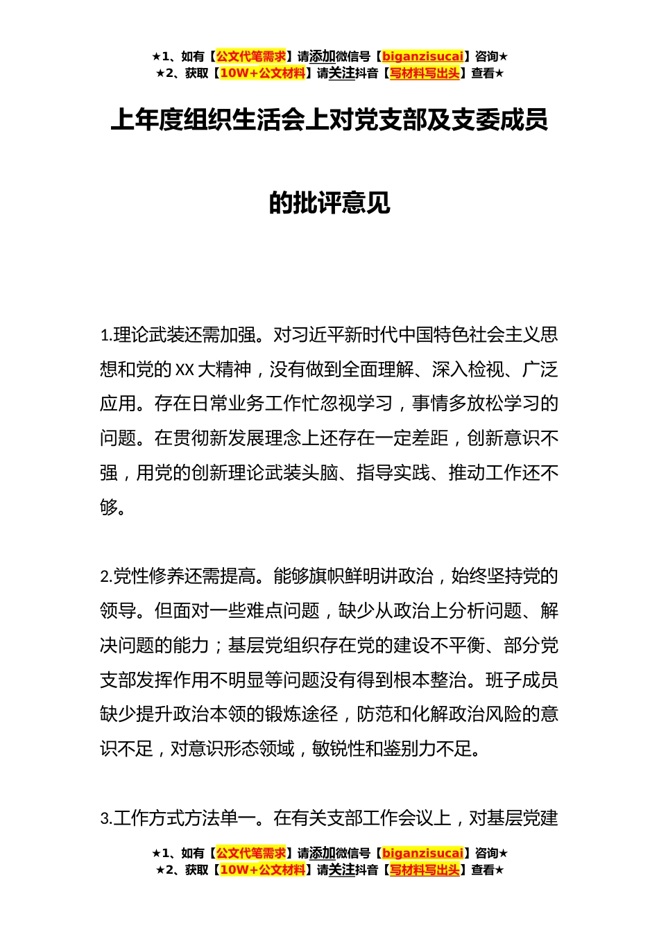 ★1、如有【公文代笔需求】请添加微信号【biganzisucai】咨询★★2、获取【10W+公文材料】请关注抖音【写材料写出头】查看★上年度组织生活会上对党支部及支委成员的批评意见1.理论武装还需加强。对习近平新时代中国特色社会主义思想和党的XX大精神,没有做到全面理解、深入检视、广泛应用。存在日常业务工作忙忽视学习,事情多放松学习的问题。在贯彻新发展理念上还存在一定差距,创新意识不强,用党的创新理论武装头脑、指导实践、推动工作还不够。2.党性修养还需提高。能够旗帜鲜明讲政治,始终坚持党的领导。但面对一些难点问题,缺少从政治上分析问题、解决问题的能力;基层党组织存在党的建设不平衡、部分党支部发挥作用不明显等问题没有得到根本整治。班子成员缺少提升政治本领的锻炼途径,防范和化解政治...