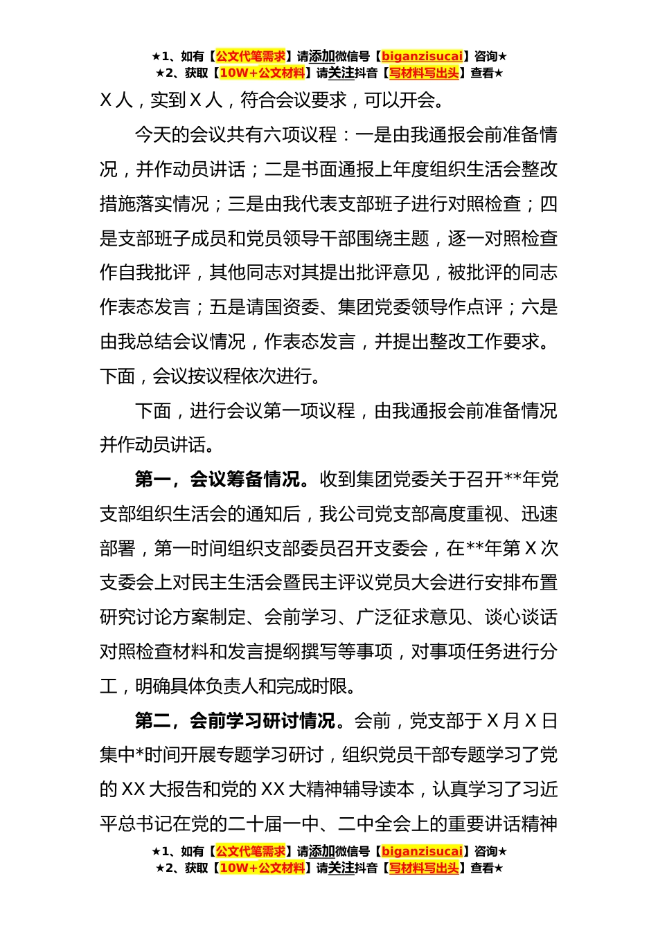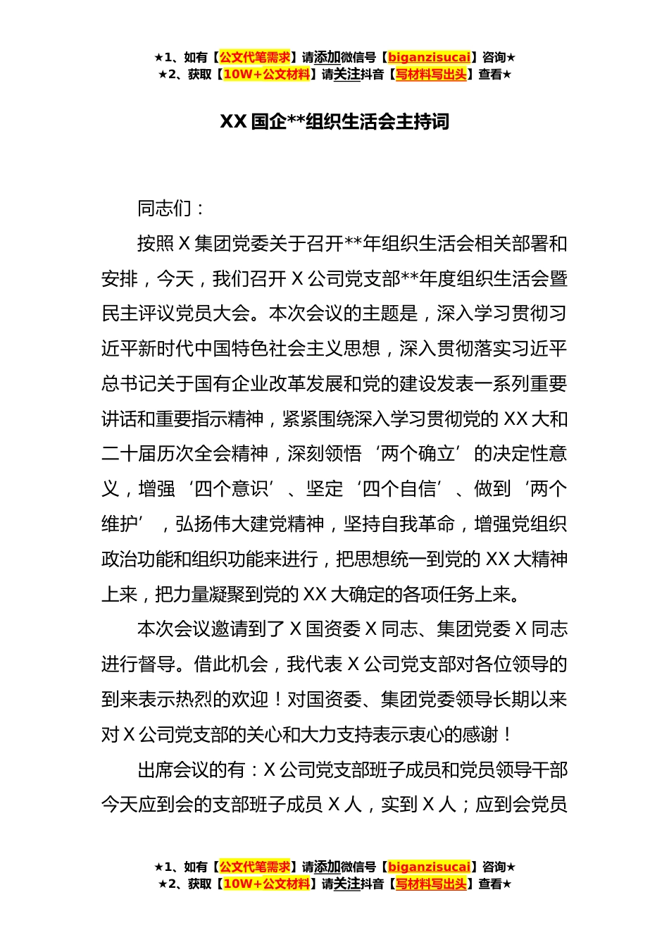 ★1、如有【公文代笔需求】请添加微信号【biganzisucai】咨询★★2、获取【10W+公文材料】请关注抖音【写材料写出头】查看★XX国企**组织生活会主持词同志们:按照X集团党委关于召开**年组织生活会相关部署和安排,今天,我们召开X公司党支部**年度组织生活会暨民主评议党员大会。本次会议的主题是,深入学习贯彻习近平新时代中国特色社会主义思想,深入贯彻落实习近平总书记关于国有企业改革发展和党的建设发表一系列重要讲话和重要指示精神,紧紧围绕深入学习贯彻党的XX大和二十届历次全会精神,深刻领悟‘两个确立’的决定性意义,增强‘四个意识’、坚定‘四个自信’、做到‘两个维护’,弘扬伟大建党精神,坚持自我革命,增强党组织政治功能和组织功能来进行,把思想统一到党的XX大精神上来,把力量凝聚到党...