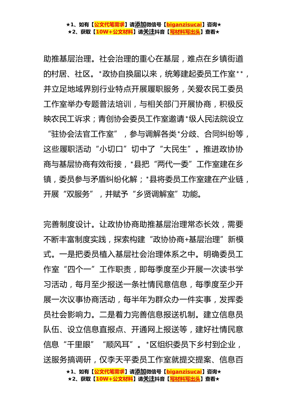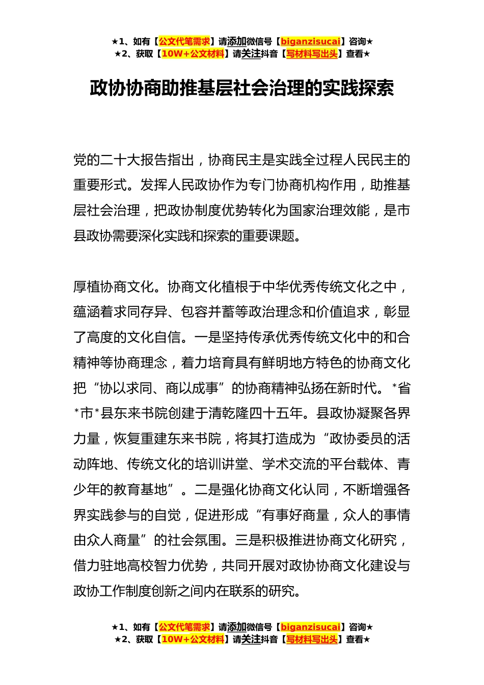 ★1、如有【公文代笔需求】请添加微信号【biganzisucai】咨询★★2、获取【10W+公文材料】请关注抖音【写材料写出头】查看★政协协商助推基层社会治理的实践探索党的二十大报告指出,协商民主是实践全过程人民民主的重要形式。发挥人民政协作为专门协商机构作用,助推基层社会治理,把政协制度优势转化为国家治理效能,是市县政协需要深化实践和探索的重要课题。厚植协商文化。协商文化植根于中华优秀传统文化之中,蕴涵着求同存异、包容并蓄等政治理念和价值追求,彰显了高度的文化自信。一是坚持传承优秀传统文化中的和合精神等协商理念,着力培育具有鲜明地方特色的协商文化把“协以求同、商以成事”的协商精神弘扬在新时代。*省*市*县东来书院创建于清乾隆四十五年。县政协凝聚各界力量,恢复重建东来书院,将...