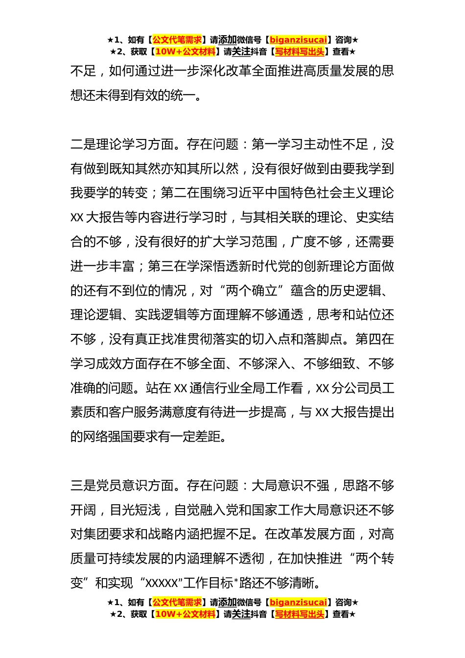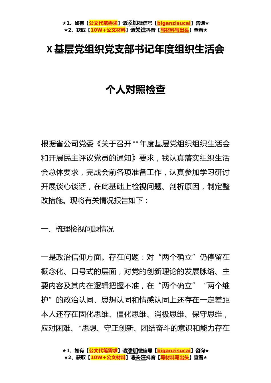 ★1、如有【公文代笔需求】请添加微信号【biganzisucai】咨询★★2、获取【10W+公文材料】请关注抖音【写材料写出头】查看★X基层党组织党支部书记年度组织生活会个人对照检查根据省公司党委《关于召开**年度基层党组织组织生活会和开展民主评议党员的通知》要求,我认真落实组织生活会总体要求,完成会前各项准备工作,认真参加学习研讨开展谈心谈话,在此基础上检视问题、剖析原因,制定整改措施。现将有关情况报告如下:一、梳理检视问题情况一是政治信仰方面。存在问题:对“两个确立”仍停留在概念化、口号式的层面,对党的创新理论的发展脉络、主要内容及其内在逻辑把握不准,在“两个确立”“两个维护”的政治认同、思想认同和情感认同上还存在一定差距本人还存在固化思维、僵化思维、消极思维、保守思维,...