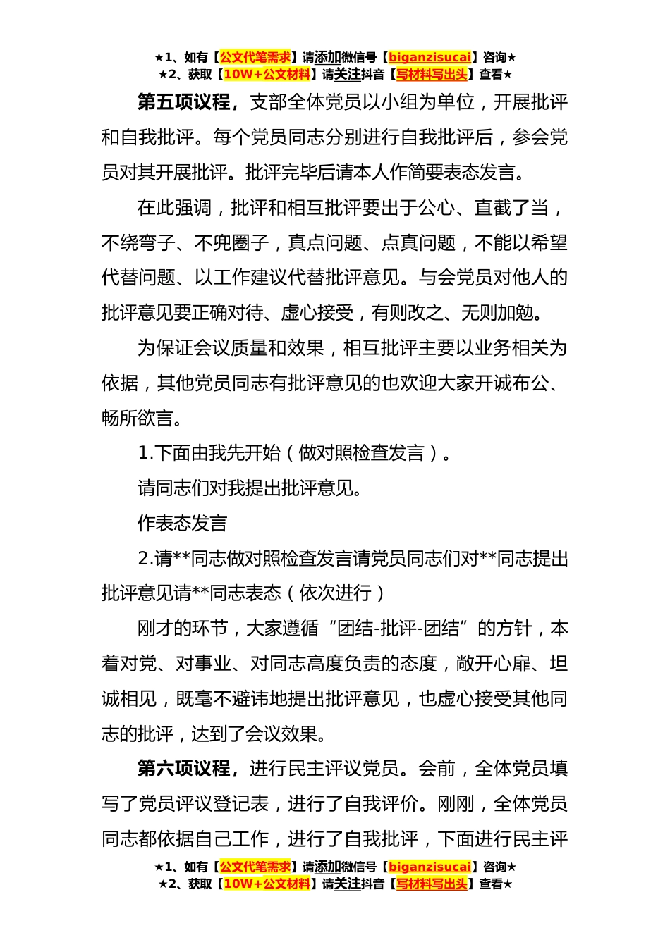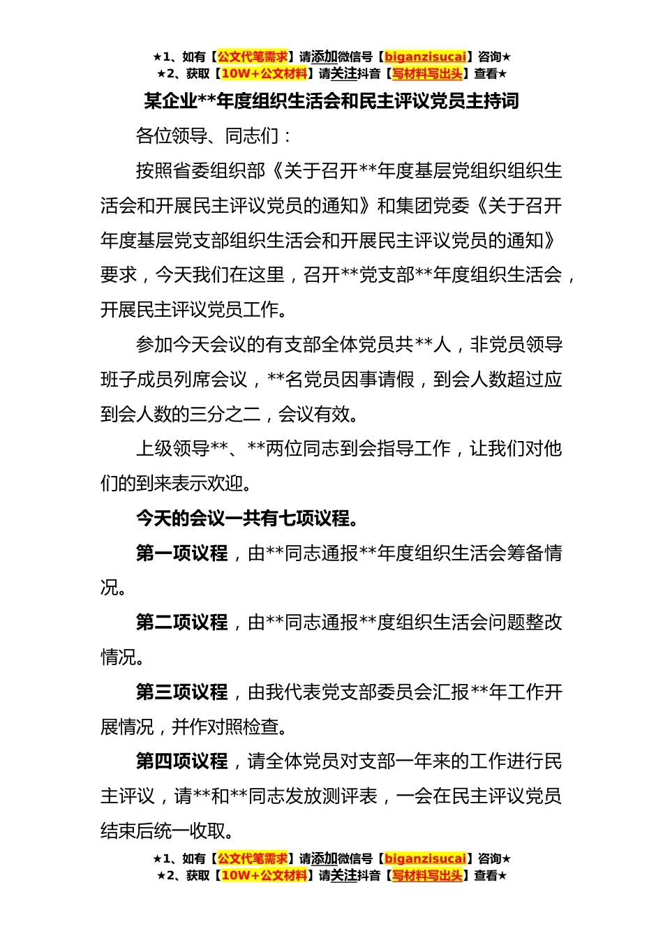 ★1、如有【公文代笔需求】请添加微信号【biganzisucai】咨询★★2、获取【10W+公文材料】请关注抖音【写材料写出头】查看★某企业**年度组织生活会和民主评议党员主持词各位领导、同志们:按照省委组织部《关于召开**年度基层党组织组织生活会和开展民主评议党员的通知》和集团党委《关于召开年度基层党支部组织生活会和开展民主评议党员的通知》要求,今天我们在这里,召开**党支部**年度组织生活会,开展民主评议党员工作。参加今天会议的有支部全体党员共**人,非党员领导班子成员列席会议,**名党员因事请假,到会人数超过应到会人数的三分之二,会议有效。上级领导**、**两位同志到会指导工作,让我们对他们的到来表示欢迎。今天的会议一共有七项议程。第一项议程,由**同志通报**年度组织生活会筹备情况。...