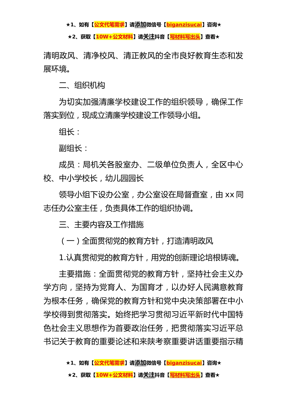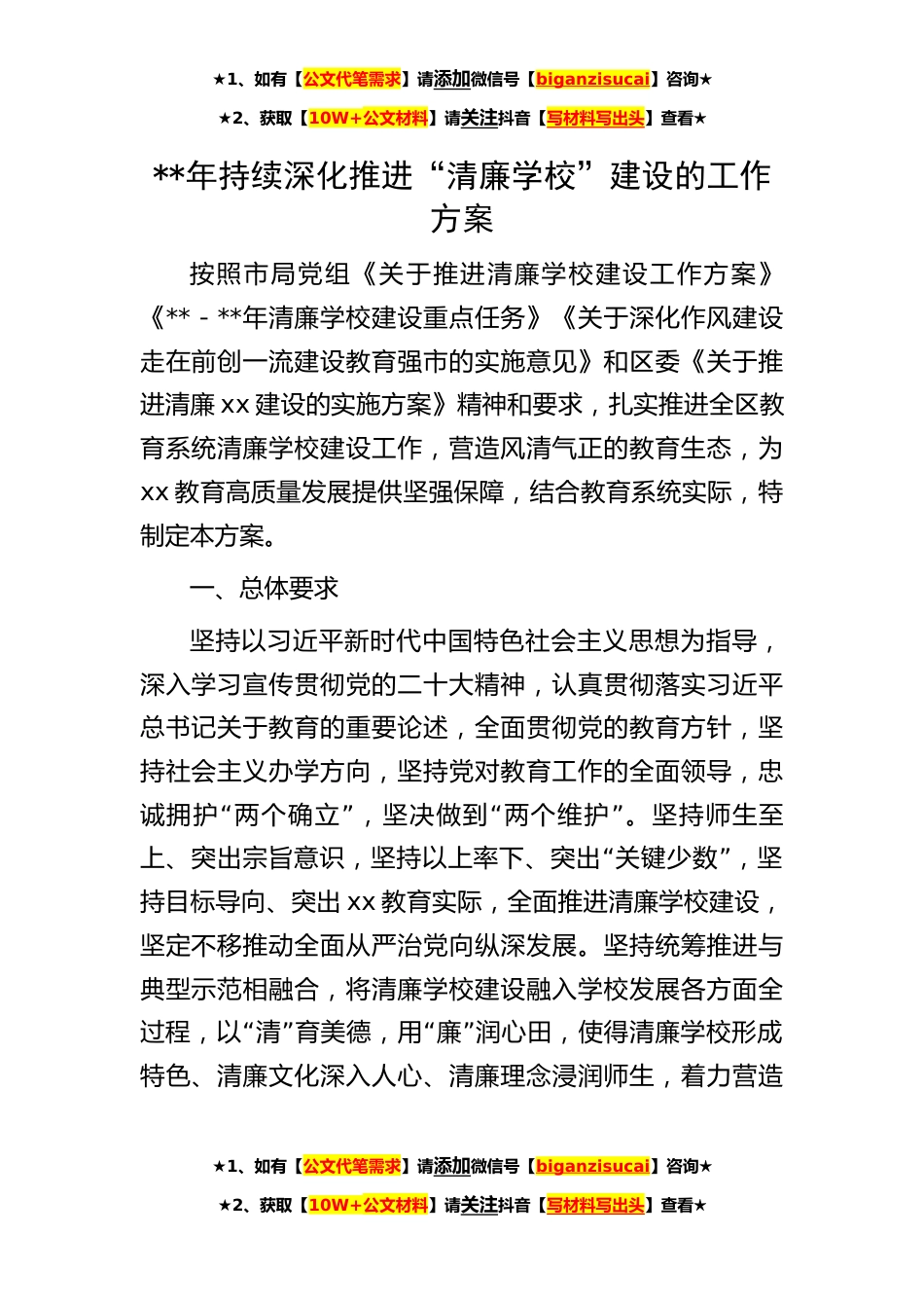 ★1、如有【公文代笔需求】请添加微信号【biganzisucai】咨询★★2、获取【10W+公文材料】请关注抖音【写材料写出头】查看★**年持续深化推进“清廉学校”建设的工作方案按照市局党组《关于推进清廉学校建设工作方案》《**-**年清廉学校建设重点任务》《关于深化作风建设走在前创一流建设教育强市的实施意见》和区委《关于推进清廉xx建设的实施方案》精神和要求,扎实推进全区教育系统清廉学校建设工作,营造风清气正的教育生态,为xx教育高质量发展提供坚强保障,结合教育系统实际,特制定本方案。一、总体要求坚持以习近平新时代中国特色社会主义思想为指导,深入学习宣传贯彻党的二十大精神,认真贯彻落实习近平总书记关于教育的重要论述,全面贯彻党的教育方针,坚持社会主义办学方向,坚持党对教育工作的全...