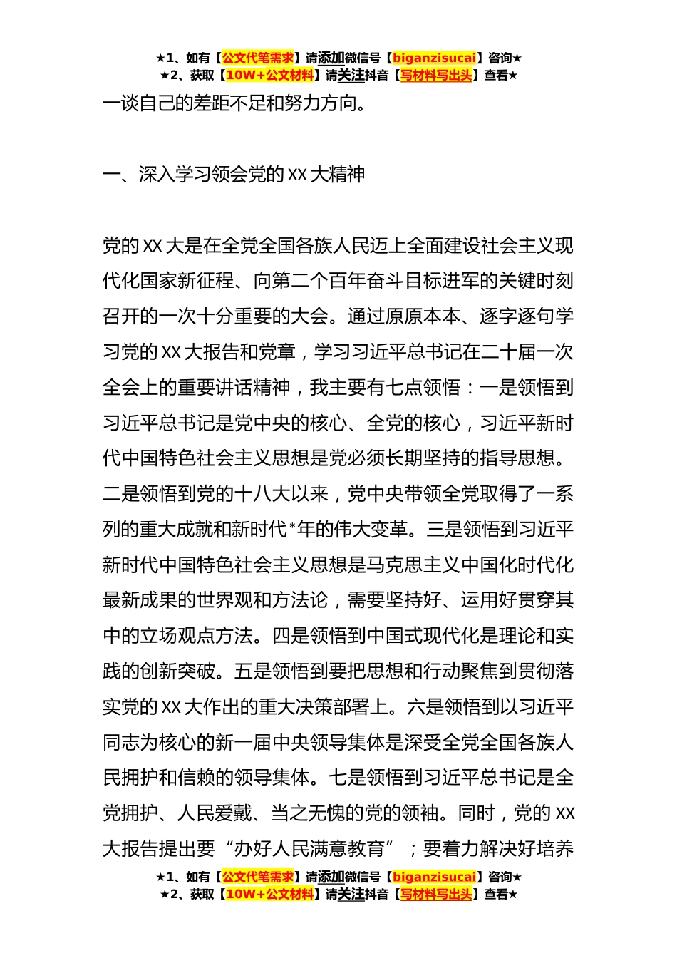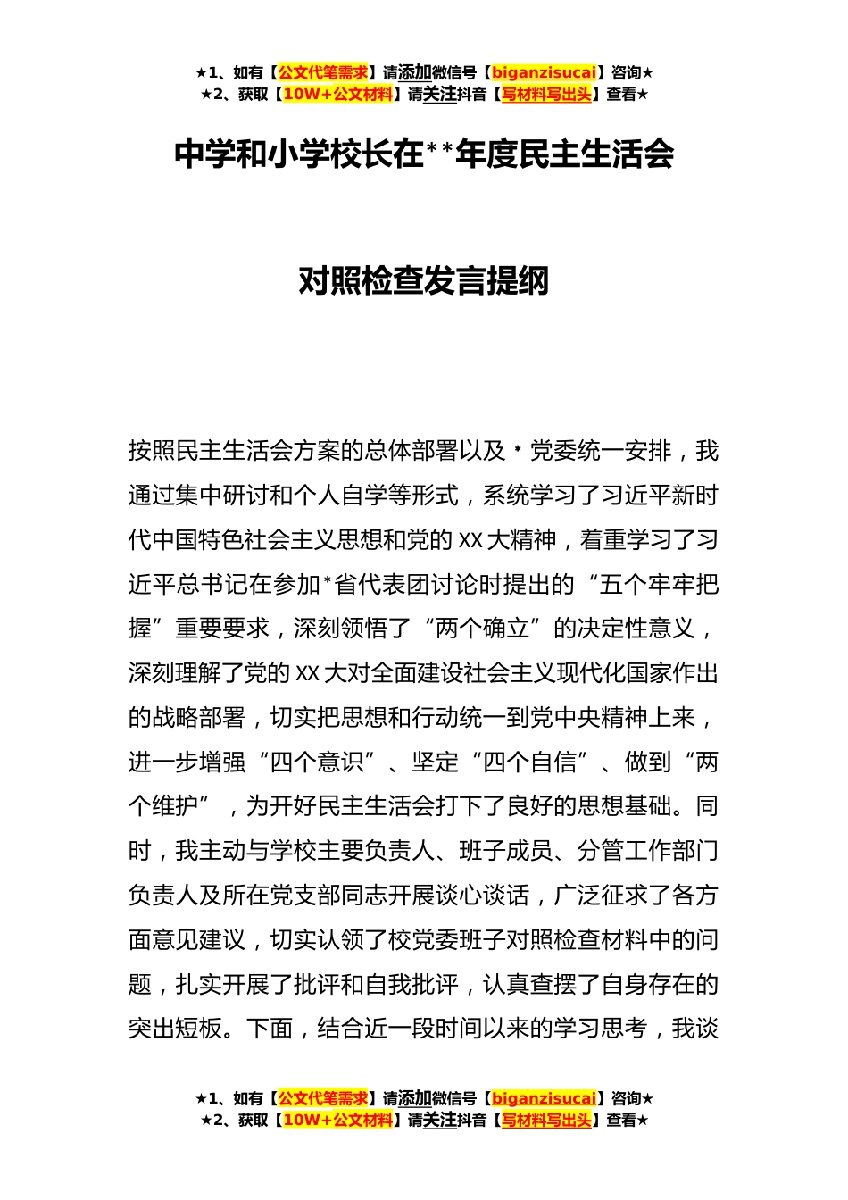 ★1、如有【公文代笔需求】请添加微信号【biganzisucai】咨询★★2、获取【10W+公文材料】请关注抖音【写材料写出头】查看★中学和小学校长在**年度民主生活会对照检查发言提纲按照民主生活会方案的总体部署以及﹡党委统一安排,我通过集中研讨和个人自学等形式,系统学习了习近平新时代中国特色社会主义思想和党的XX大精神,着重学习了习近平总书记在参加*省代表团讨论时提出的“五个牢牢把握”重要要求,深刻领悟了“两个确立”的决定性意义,深刻理解了党的XX大对全面建设社会主义现代化国家作出的战略部署,切实把思想和行动统一到党中央精神上来,进一步增强“四个意识”、坚定“四个自信”、做到“两个维护”,为开好民主生活会打下了良好的思想基础。同时,我主动与学校主要负责人、班子成员、分管工作部门...