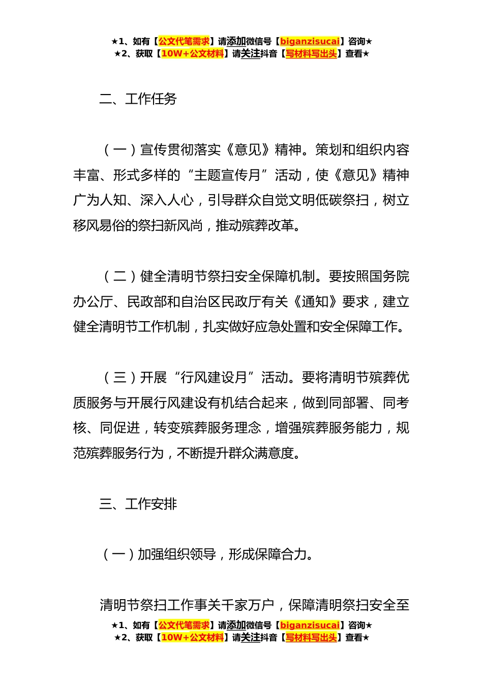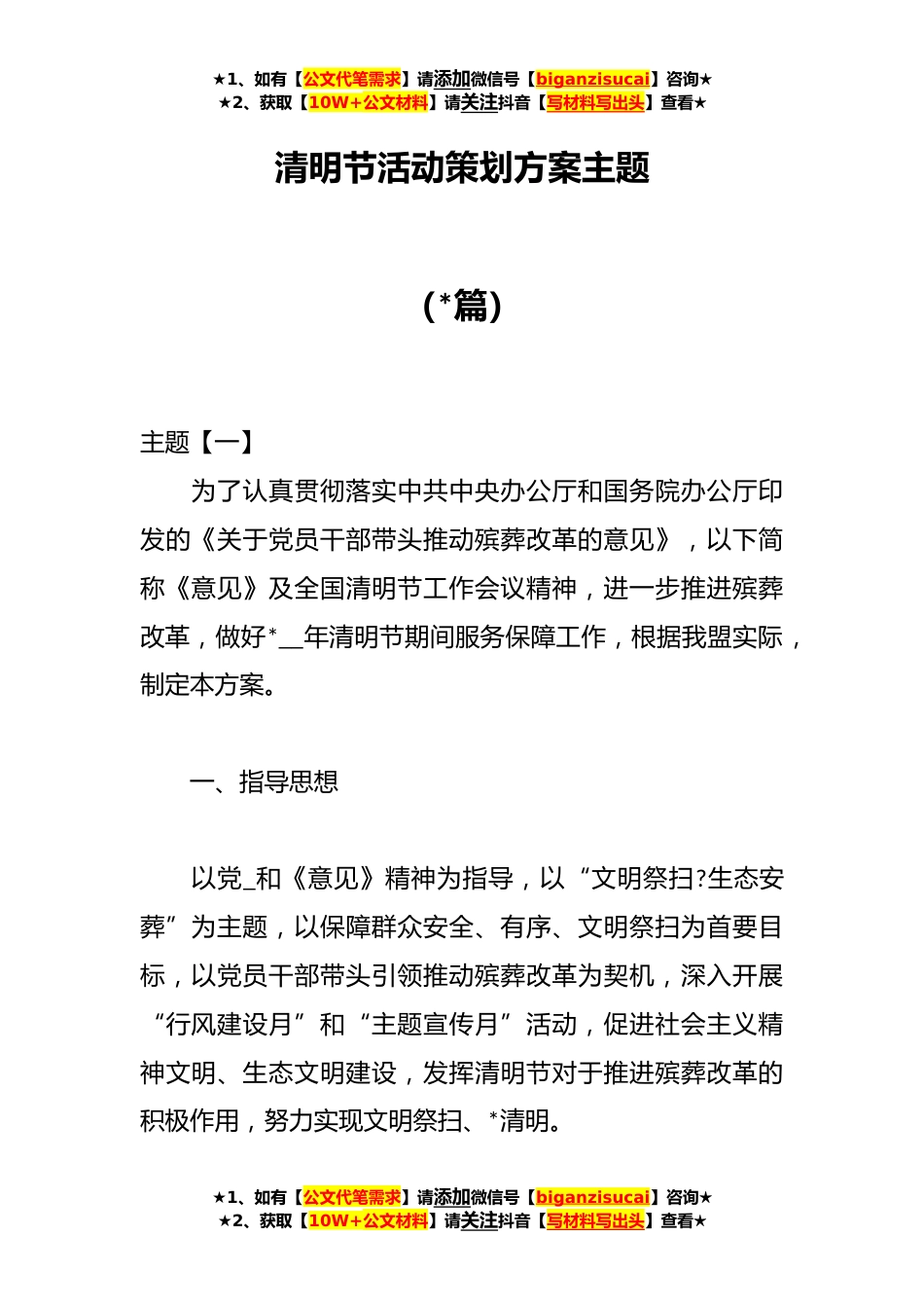 ★1、如有【公文代笔需求】请添加微信号【biganzisucai】咨询★★2、获取【10W+公文材料】请关注抖音【写材料写出头】查看★清明节活动策划方案主题(*篇)主题【一】为了认真贯彻落实中共中央办公厅和国务院办公厅印发的《关于党员干部带头推动殡葬改革的意见》,以下简称《意见》及全国清明节工作会议精神,进一步推进殡葬改革,做好*__年清明节期间服务保障工作,根据我盟实际,制定本方案。一、指导思想以党_和《意见》精神为指导,以“文明祭扫?生态安葬”为主题,以保障群众安全、有序、文明祭扫为首要目标,以党员干部带头引领推动殡葬改革为契机,深入开展“行风建设月”和“主题宣传月”活动,促进社会主义精神文明、生态文明建设,发挥清明节对于推进殡葬改革的积极作用,努力实现文明祭扫、*清明。★1...