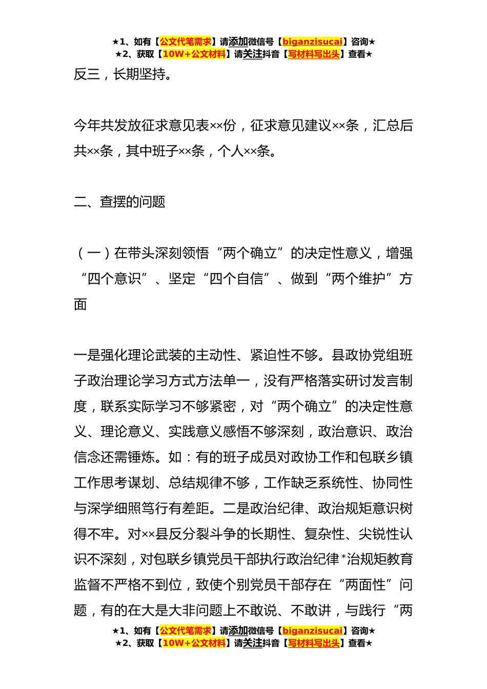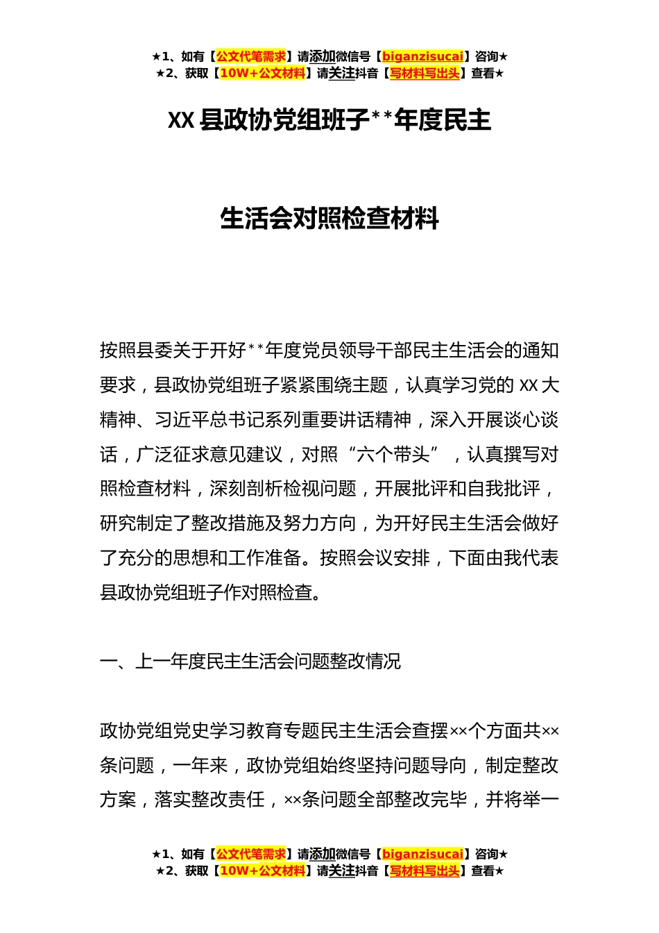 ★1、如有【公文代笔需求】请添加微信号【biganzisucai】咨询★★2、获取【10W+公文材料】请关注抖音【写材料写出头】查看★XX县政协党组班子**年度民主生活会对照检查材料按照县委关于开好**年度党员领导干部民主生活会的通知要求,县政协党组班子紧紧围绕主题,认真学习党的XX大精神、习近平总书记系列重要讲话精神,深入开展谈心谈话,广泛征求意见建议,对照“六个带头”,认真撰写对照检查材料,深刻剖析检视问题,开展批评和自我批评,研究制定了整改措施及努力方向,为开好民主生活会做好了充分的思想和工作准备。按照会议安排,下面由我代表县政协党组班子作对照检查。一、上一年度民主生活会问题整改情况政协党组党史学习教育专题民主生活会查摆××个方面共××条问题,一年来,政协党组始终坚持问题导...