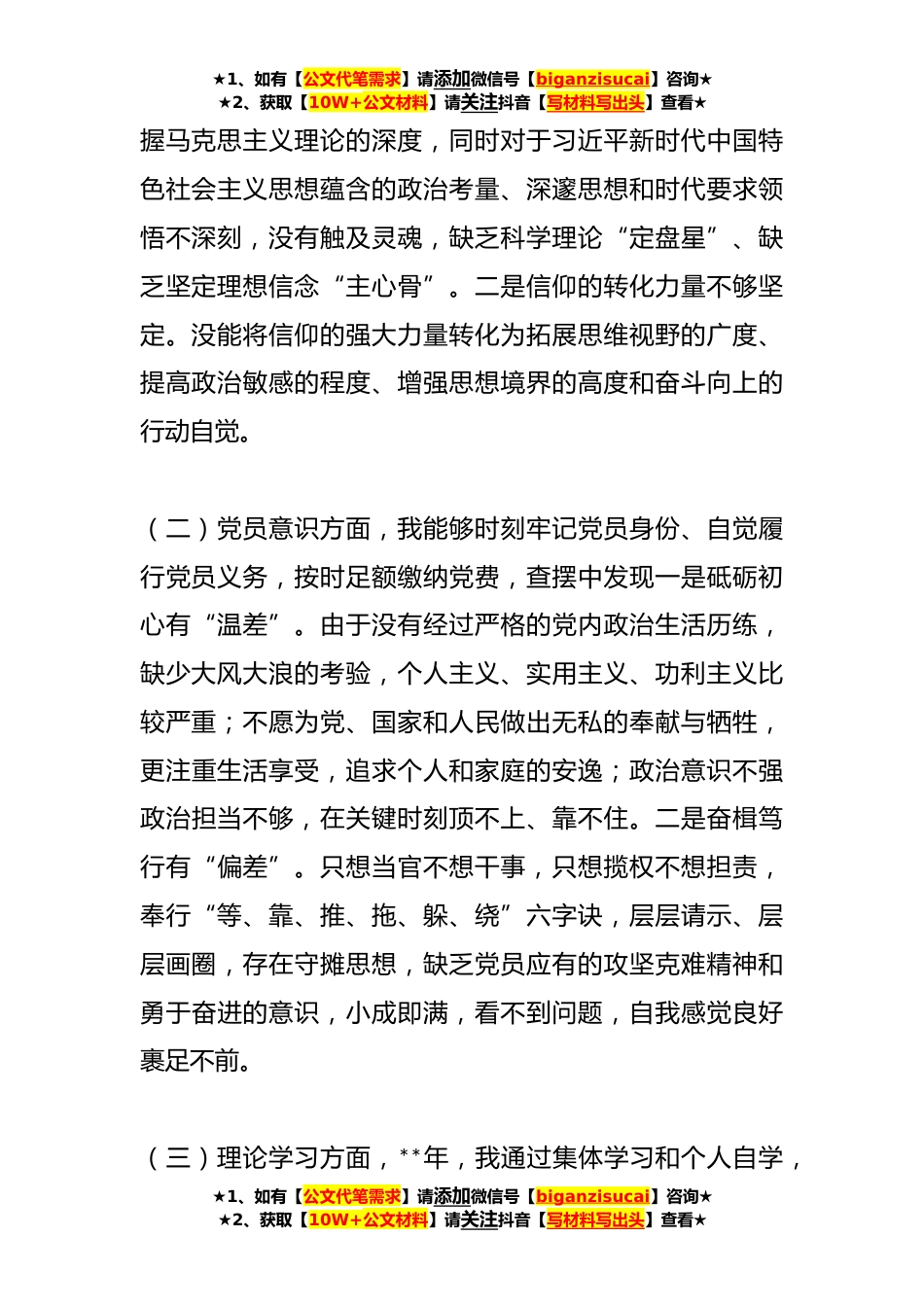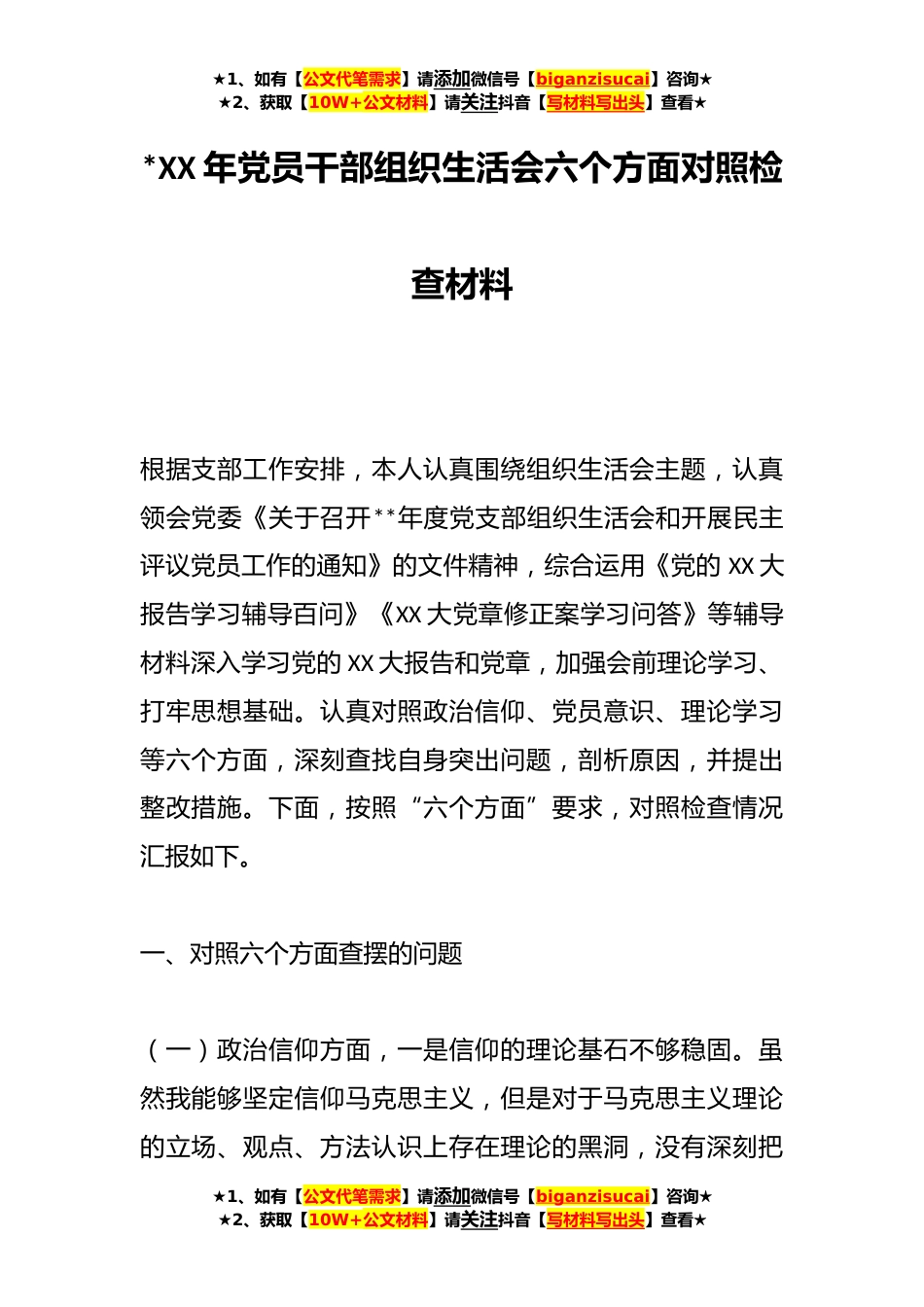 ★1、如有【公文代笔需求】请添加微信号【biganzisucai】咨询★★2、获取【10W+公文材料】请关注抖音【写材料写出头】查看★*XX年党员干部组织生活会六个方面对照检查材料根据支部工作安排,本人认真围绕组织生活会主题,认真领会党委《关于召开**年度党支部组织生活会和开展民主评议党员工作的通知》的文件精神,综合运用《党的XX大报告学习辅导百问》《XX大党章修正案学习问答》等辅导材料深入学习党的XX大报告和党章,加强会前理论学习、打牢思想基础。认真对照政治信仰、党员意识、理论学习等六个方面,深刻查找自身突出问题,剖析原因,并提出整改措施。下面,按照“六个方面”要求,对照检查情况汇报如下。一、对照六个方面查摆的问题(一)政治信仰方面,一是信仰的理论基石不够稳固。虽然我能够坚定信仰马...