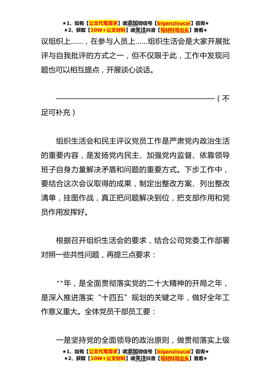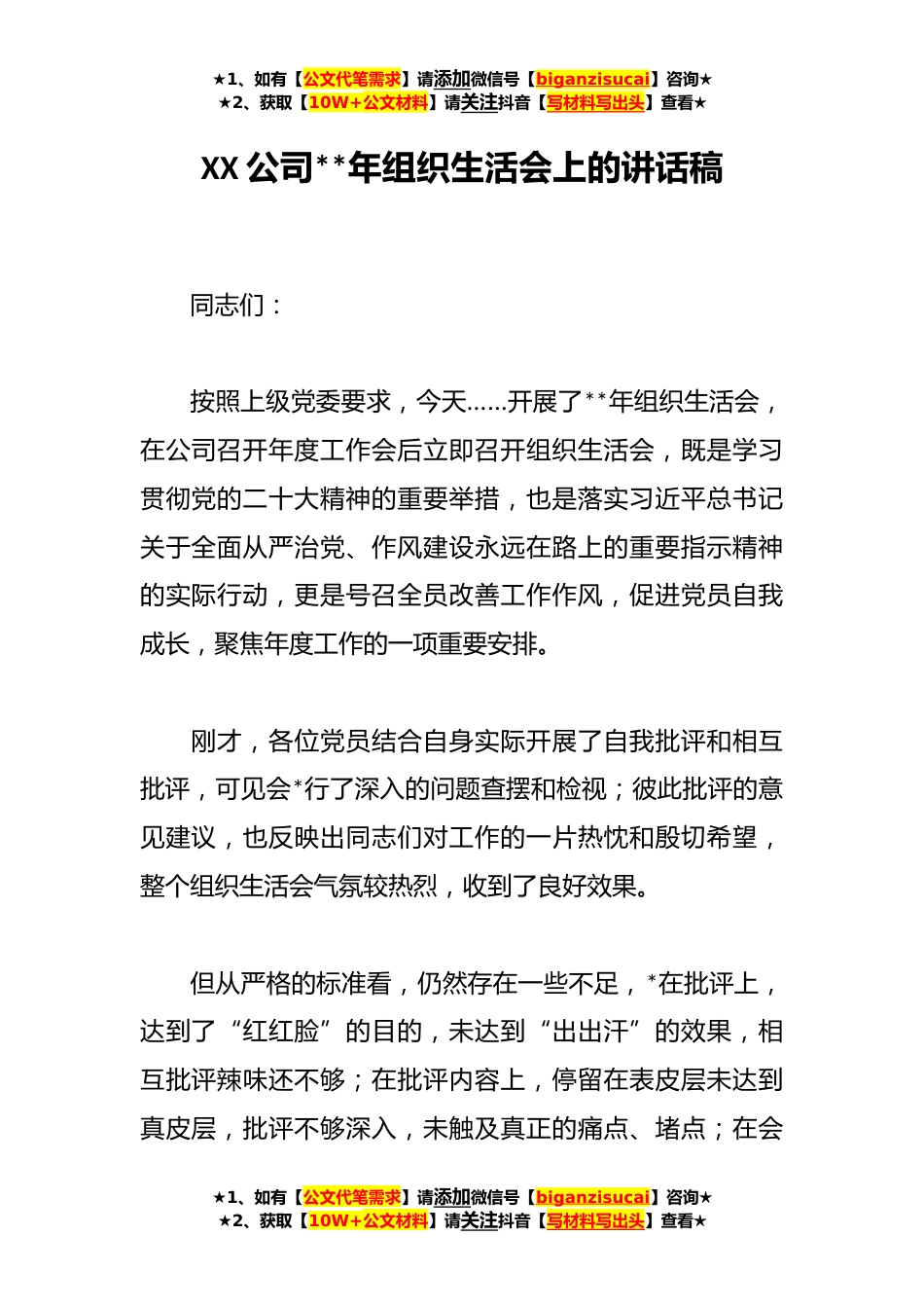 ★1、如有【公文代笔需求】请添加微信号【biganzisucai】咨询★★2、获取【10W+公文材料】请关注抖音【写材料写出头】查看★XX公司**年组织生活会上的讲话稿同志们:按照上级党委要求,今天……开展了**年组织生活会,在公司召开年度工作会后立即召开组织生活会,既是学习贯彻党的二十大精神的重要举措,也是落实习近平总书记关于全面从严治党、作风建设永远在路上的重要指示精神的实际行动,更是号召全员改善工作作风,促进党员自我成长,聚焦年度工作的一项重要安排。刚才,各位党员结合自身实际开展了自我批评和相互批评,可见会*行了深入的问题查摆和检视;彼此批评的意见建议,也反映出同志们对工作的一片热忱和殷切希望,整个组织生活会气氛较热烈,收到了良好效果。但从严格的标准看,仍然存在一些不足,*...