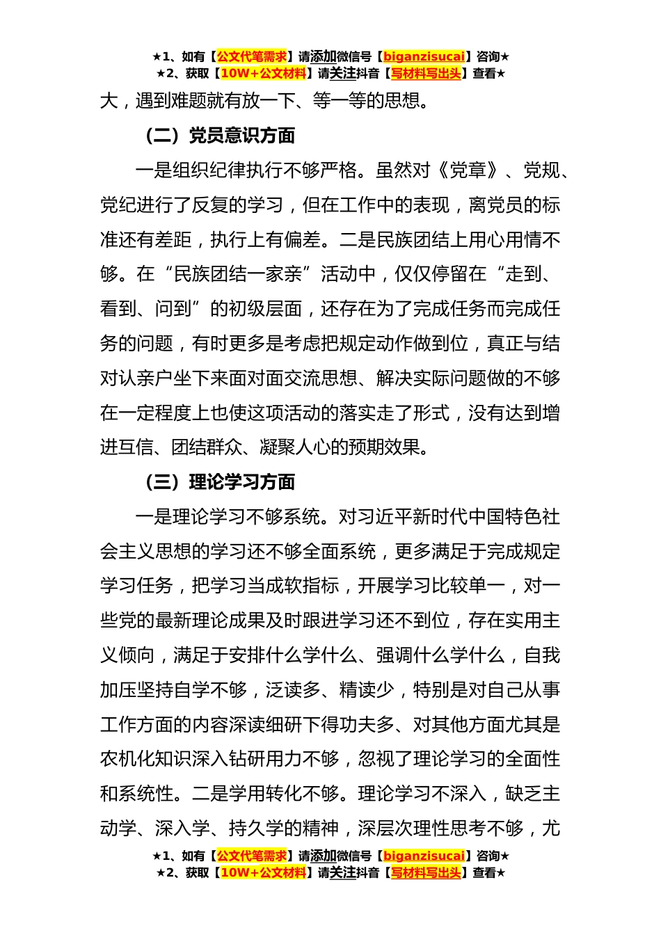 ★1、如有【公文代笔需求】请添加微信号【biganzisucai】咨询★★2、获取【10W+公文材料】请关注抖音【写材料写出头】查看★XX基层*XX年党组织生活会六个方面对照检查材料根据《关于开展**年度基层党组织组织生活会民主评议党员和评优评先工作的通知》,本人按照要求,参加集中学习和个人自学,同学习自治区党委十届七次全会精神结合起来,根据征求的意见建议和自身查找的不足,对照新时代合格党员标准,对照入党誓词,对照革命先辈和先进典型,联系实际从以下六个方面进行党性分析,现将个人对照检查材料汇报如下:一、存在的问题(一)政治信仰方面一是政治意识不强。对习近平总书记重要讲话、指示精神学习不深理解不透,在树牢“四个意识”,坚定“四个自信”,坚决做到“两个维护”方面,思想认识不到位习惯性...