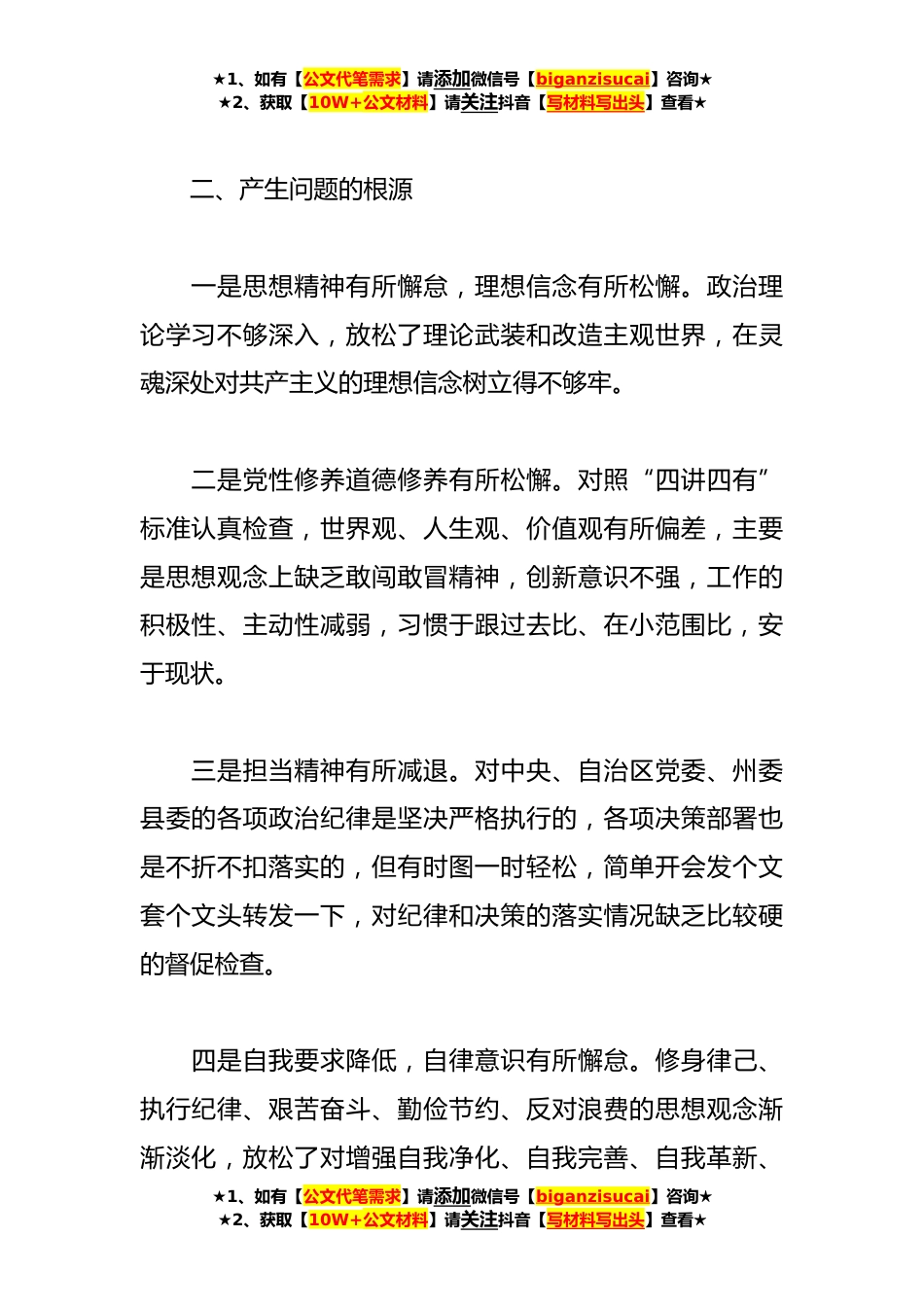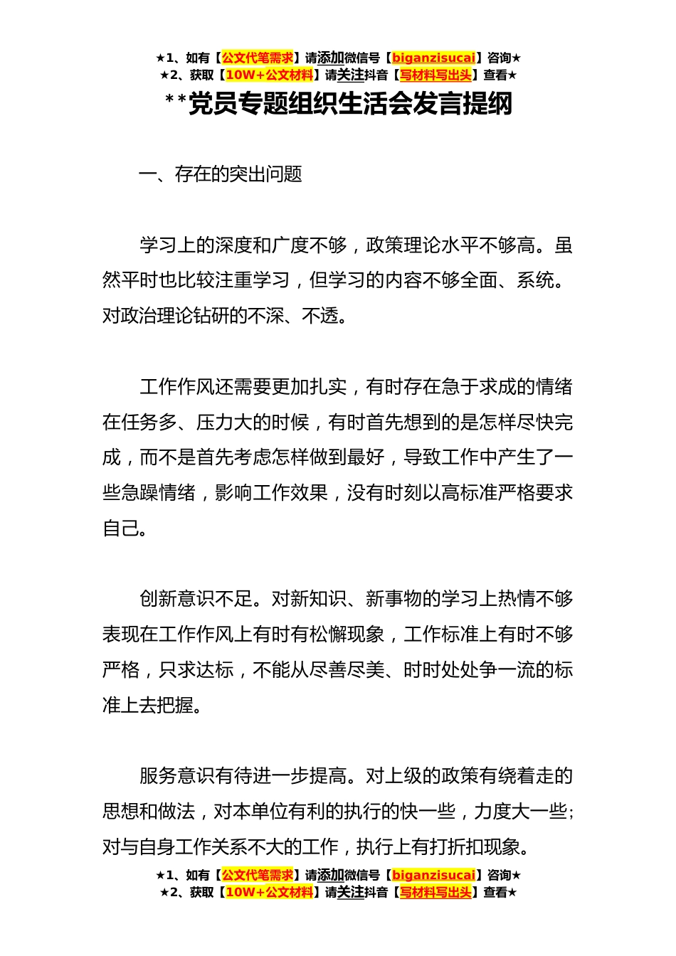★1、如有【公文代笔需求】请添加微信号【biganzisucai】咨询★★2、获取【10W+公文材料】请关注抖音【写材料写出头】查看★**党员专题组织生活会发言提纲一、存在的突出问题学习上的深度和广度不够,政策理论水平不够高。虽然平时也比较注重学习,但学习的内容不够全面、系统。对政治理论钻研的不深、不透。工作作风还需要更加扎实,有时存在急于求成的情绪在任务多、压力大的时候,有时首先想到的是怎样尽快完成,而不是首先考虑怎样做到最好,导致工作中产生了一些急躁情绪,影响工作效果,没有时刻以高标准严格要求自己。创新意识不足。对新知识、新事物的学习上热情不够表现在工作作风上有时有松懈现象,工作标准上有时不够严格,只求达标,不能从尽善尽美、时时处处争一流的标准上去把握。服务意识有待进一...