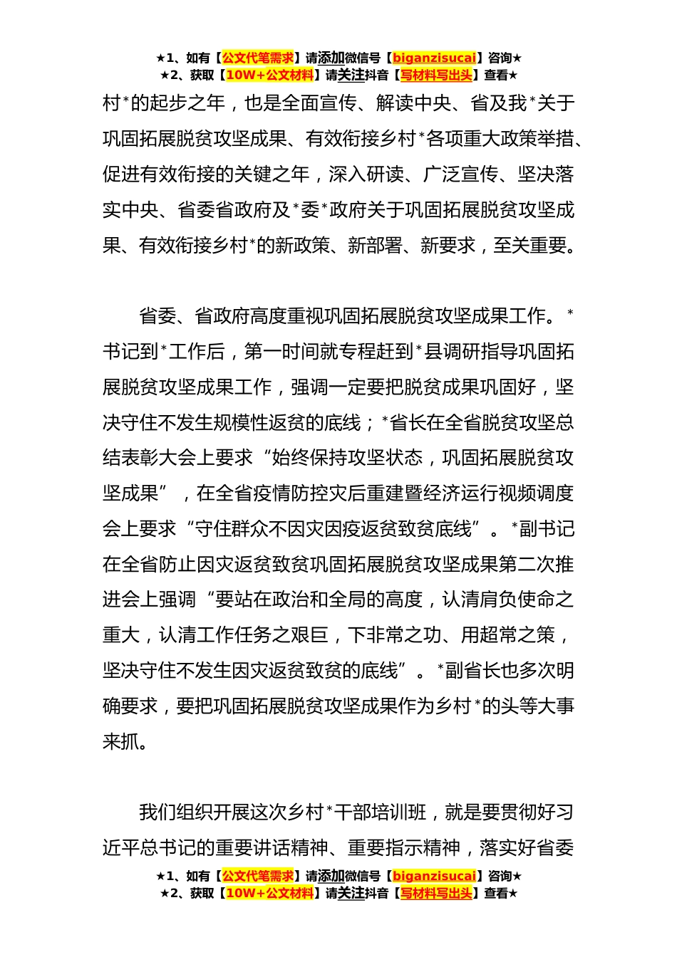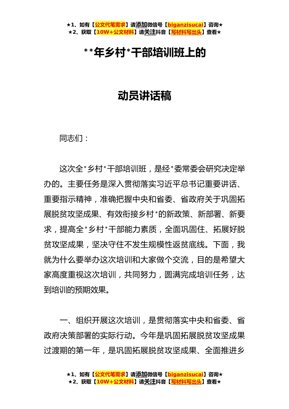 ★1、如有【公文代笔需求】请添加微信号【biganzisucai】咨询★★2、获取【10W+公文材料】请关注抖音【写材料写出头】查看★**年乡村*干部培训班上的动员讲话稿同志们:这次全*乡村*干部培训班,是经*委常委会研究决定举办的。主要任务是深入贯彻落实习近平总书记重要讲话、重要指示精神,准确把握中央和省委、省政府关于巩固拓展脱贫攻坚成果、有效衔接乡村*的新政策、新部署、新要求,提高全*乡村*干部能力素质,全面巩固住、拓展好脱贫攻坚成果,坚决守住不发生规模性返贫底线。下面,我就为什么要举办这次培训和大家做个交流,目的是希望大家高度重视这次培训,共同努力,圆满完成培训任务,达到培训的预期效果。一、组织开展这次培训,是贯彻落实中央和省委、省政府决策部署的实际行动。今年是巩固拓展脱贫攻...