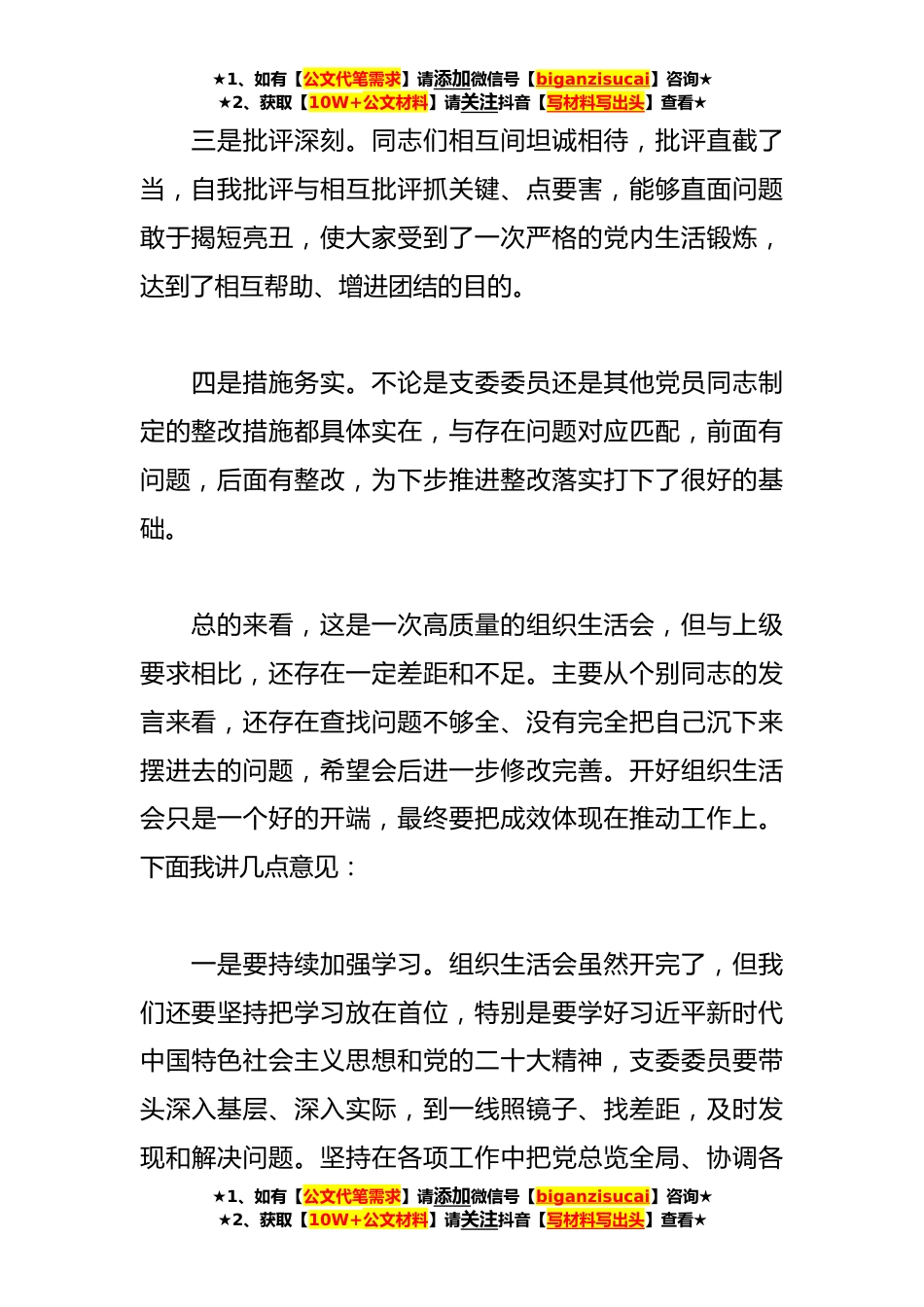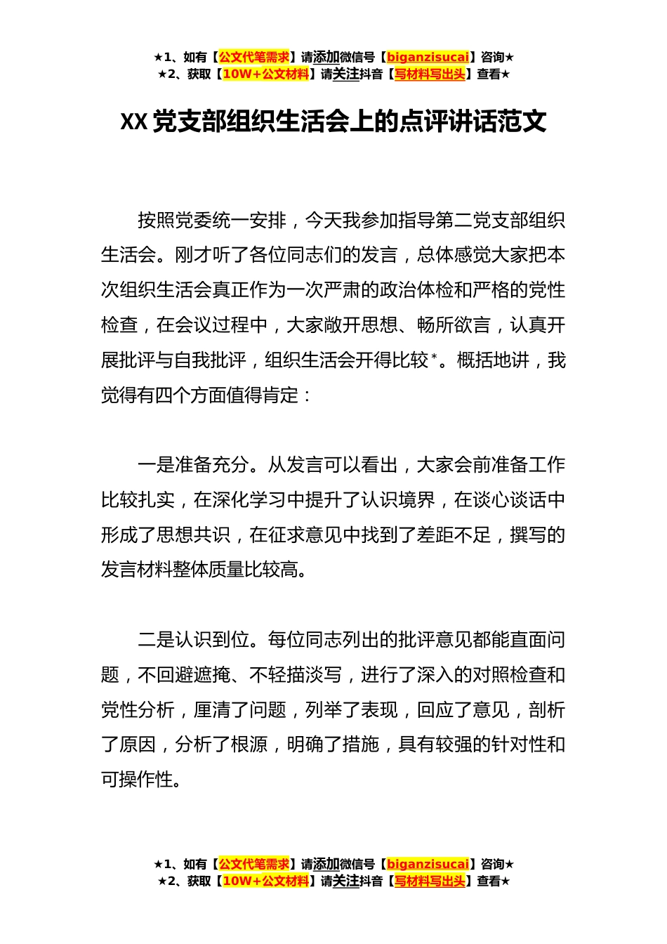 ★1、如有【公文代笔需求】请添加微信号【biganzisucai】咨询★★2、获取【10W+公文材料】请关注抖音【写材料写出头】查看★XX党支部组织生活会上的点评讲话范文按照党委统一安排,今天我参加指导第二党支部组织生活会。刚才听了各位同志们的发言,总体感觉大家把本次组织生活会真正作为一次严肃的政治体检和严格的党性检查,在会议过程中,大家敞开思想、畅所欲言,认真开展批评与自我批评,组织生活会开得比较*。概括地讲,我觉得有四个方面值得肯定:一是准备充分。从发言可以看出,大家会前准备工作比较扎实,在深化学习中提升了认识境界,在谈心谈话中形成了思想共识,在征求意见中找到了差距不足,撰写的发言材料整体质量比较高。二是认识到位。每位同志列出的批评意见都能直面问题,不回避遮掩、不轻描淡写...