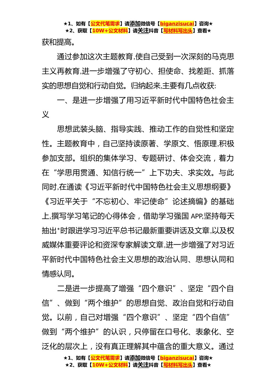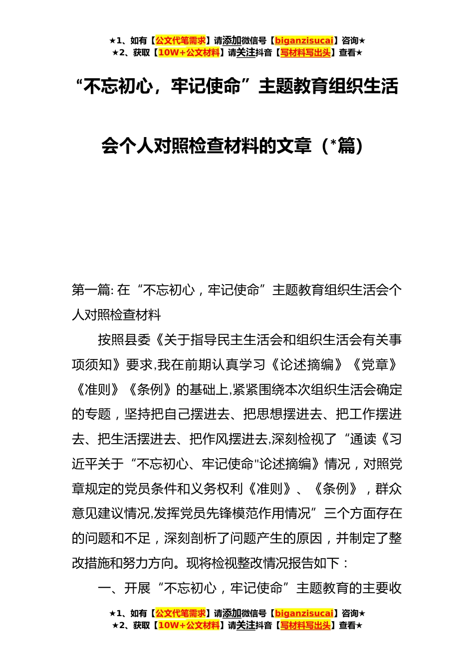 ★1、如有【公文代笔需求】请添加微信号【biganzisucai】咨询★★2、获取【10W+公文材料】请关注抖音【写材料写出头】查看★“不忘初心,牢记使命”主题教育组织生活会个人对照检查材料的文章(*篇)第一篇:在“不忘初心,牢记使命”主题教育组织生活会个人对照检查材料按照县委《关于指导民主生活会和组织生活会有关事项须知》要求,我在前期认真学习《论述摘编》《党章》《准则》《条例》的基础上,紧紧围绕本次组织生活会确定的专题,坚持把自己摆进去、把思想摆进去、把工作摆进去、把生活摆进去、把作风摆进去,深刻检视了“通读《习近平关于“不忘初心、牢记使命"论述摘编》情况,对照党章规定的党员条件和义务权利《准则》、《条例》,群众意见建议情况,发挥党员先锋模范作用情况”三个方面存在的问题和不足,...