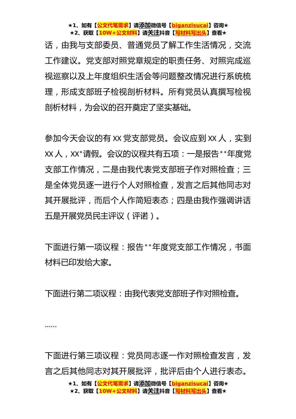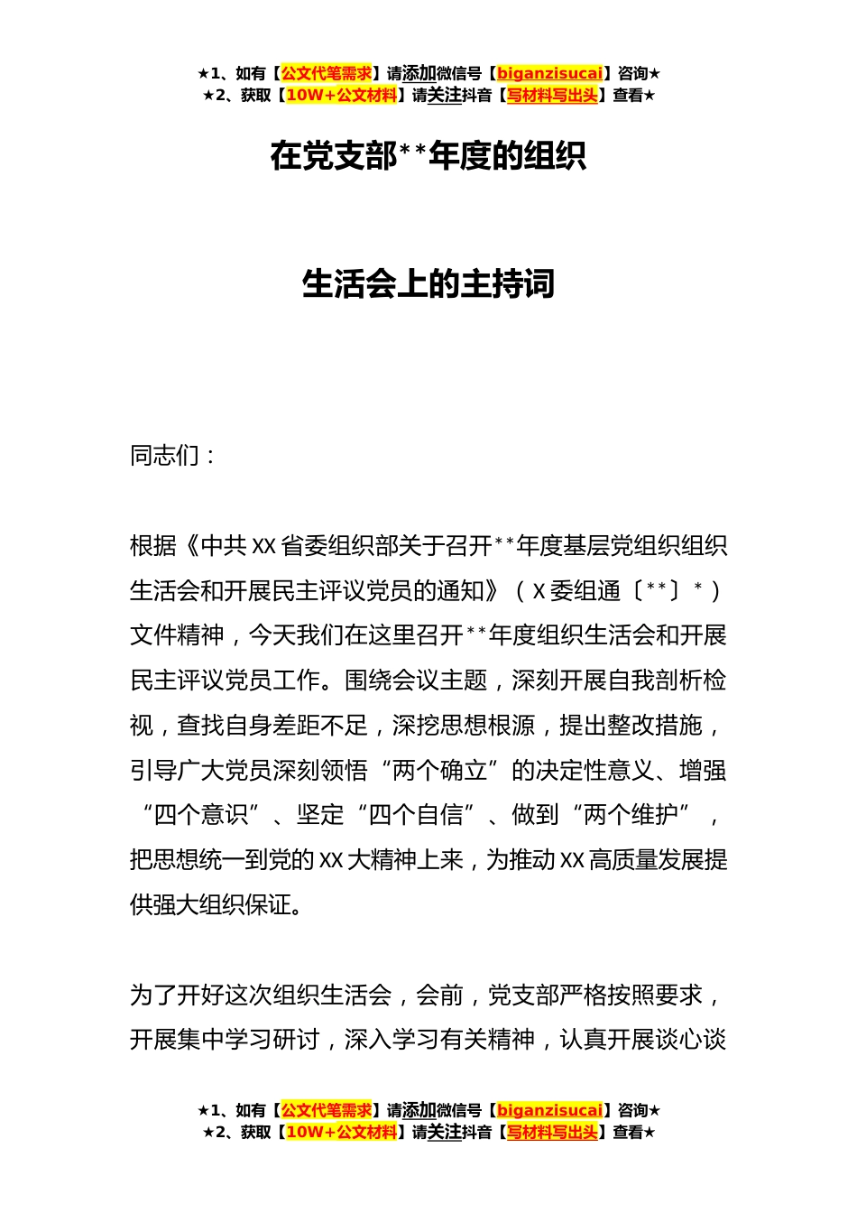 ★1、如有【公文代笔需求】请添加微信号【biganzisucai】咨询★★2、获取【10W+公文材料】请关注抖音【写材料写出头】查看★在党支部**年度的组织生活会上的主持词同志们:根据《中共XX省委组织部关于召开**年度基层党组织组织生活会和开展民主评议党员的通知》(X委组通〔**〕*)文件精神,今天我们在这里召开**年度组织生活会和开展民主评议党员工作。围绕会议主题,深刻开展自我剖析检视,查找自身差距不足,深挖思想根源,提出整改措施,引导广大党员深刻领悟“两个确立”的决定性意义、增强“四个意识”、坚定“四个自信”、做到“两个维护”,把思想统一到党的XX大精神上来,为推动XX高质量发展提供强大组织保证。为了开好这次组织生活会,会前,党支部严格按照要求,开展集中学习研讨,深入学习有关精神,...