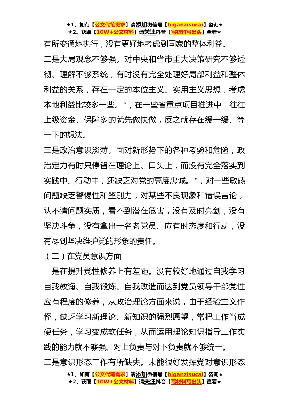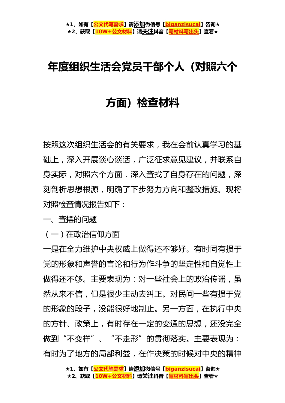 ★1、如有【公文代笔需求】请添加微信号【biganzisucai】咨询★★2、获取【10W+公文材料】请关注抖音【写材料写出头】查看★年度组织生活会党员干部个人(对照六个方面)检查材料按照这次组织生活会的有关要求,我在会前认真学习的基础上,深入开展谈心谈话,广泛征求意见建议,并联系自身实际,对照六个方面,深入查找了自身存在的问题,深刻剖析思想根源,明确了下步努力方向和整改措施。现将对照检查情况报告如下:一、查摆的问题(一)在政治信仰方面一是在全力维护中央权威上做得还不够好。有时同有损于党的形象和声誉的言论和行为作斗争的坚定性和自觉性上做得还不够。主要表现为:对一些社会上的政治传谣,虽然从来不信,但是很少主动去纠正。对民间一些有损于党的形象的段子,没能很好地制止。另一方面,...