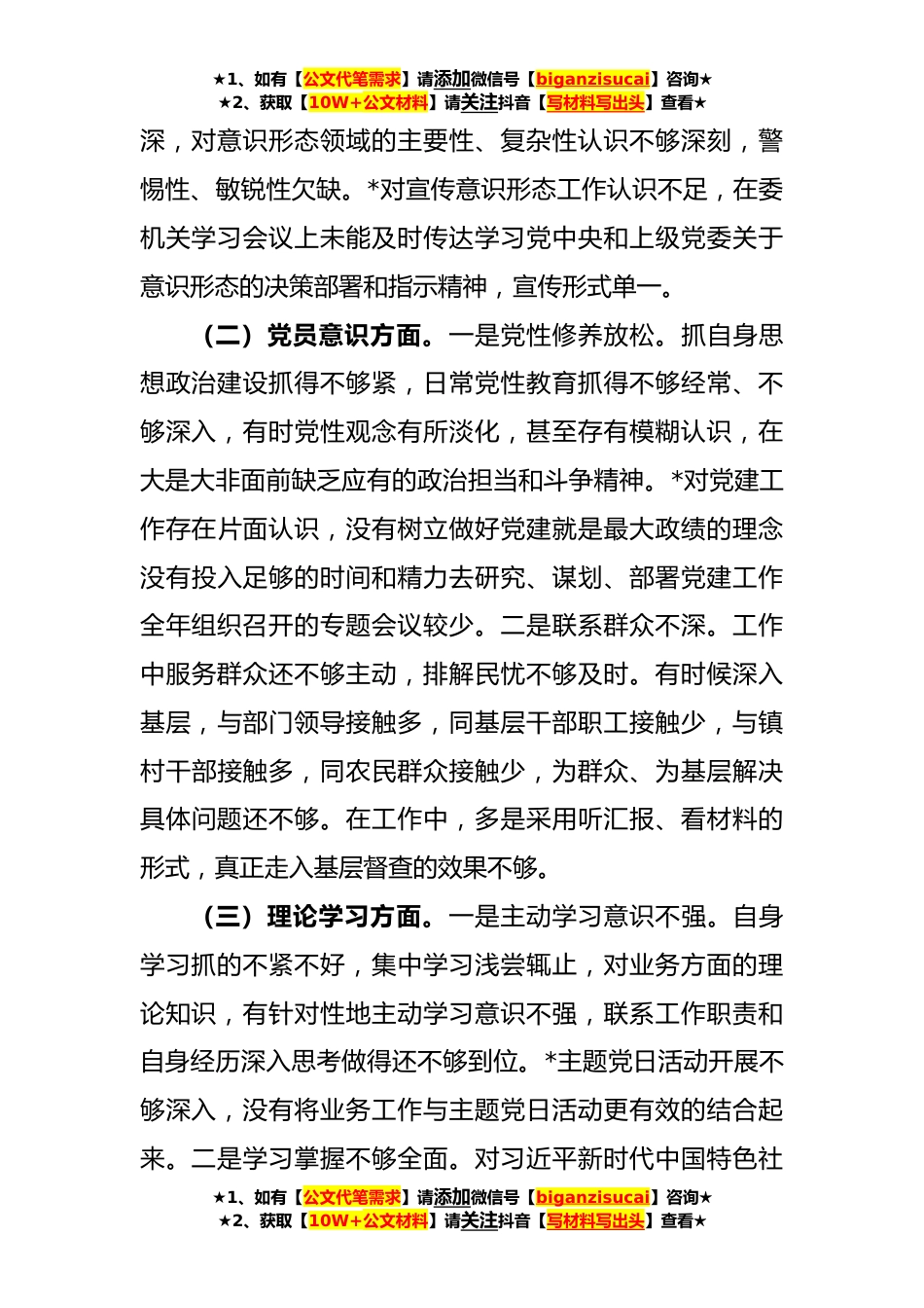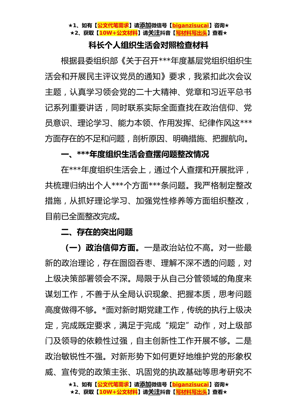★1、如有【公文代笔需求】请添加微信号【biganzisucai】咨询★★2、获取【10W+公文材料】请关注抖音【写材料写出头】查看★科长个人组织生活会对照检查材料根据县委组织部《关于召开***年度基层党组织组织生活会和开展民主评议党员的通知》要求,我紧扣此次会议主题,认真学习领会党的二十大精神、党章和习近平总书记系列重要讲话,同时联系实际全面查找在政治信仰、党员意识、理论学习、能力本领、作用发挥、纪律作风这***方面存在的不足和问题,剖析原因、明确措施、把握航向。一、***年度组织生活会查摆问题整改情况在***年度组织生活会上,通过个人查摆和开展批评,共梳理归纳出个人***个方面***条问题。我严格制定整改措施,从抓好理论学习、加强党性修养等方面组织整改,目前已全面整改完成。二、存在的突...