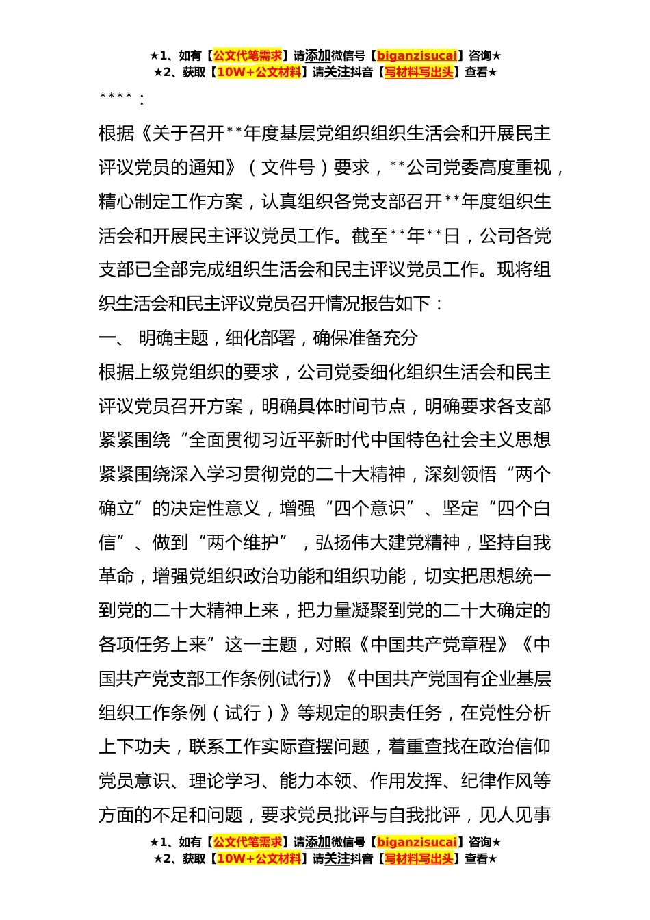 ★1、如有【公文代笔需求】请添加微信号【biganzisucai】咨询★★2、获取【10W+公文材料】请关注抖音【写材料写出头】查看★****:根据《关于召开**年度基层党组织组织生活会和开展民主评议党员的通知》(文件号)要求,**公司党委高度重视,精心制定工作方案,认真组织各党支部召开**年度组织生活会和开展民主评议党员工作。截至**年**日,公司各党支部已全部完成组织生活会和民主评议党员工作。现将组织生活会和民主评议党员召开情况报告如下:一、明确主题,细化部署,确保准备充分根据上级党组织的要求,公司党委细化组织生活会和民主评议党员召开方案,明确具体时间节点,明确要求各支部紧紧围绕“全面贯彻习近平新时代中国特色社会主义思想紧紧围绕深入学习贯彻党的二十大精神,深刻领悟“两个确立”的决定...