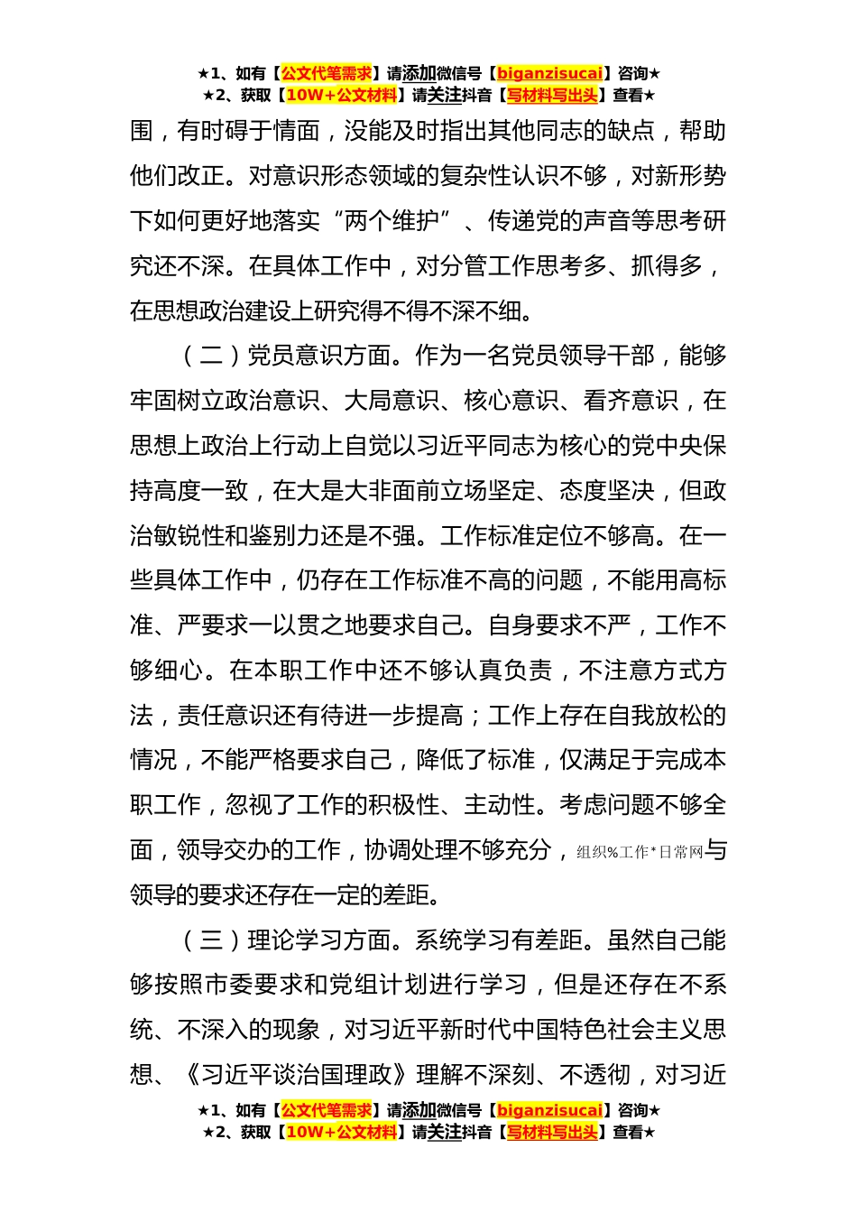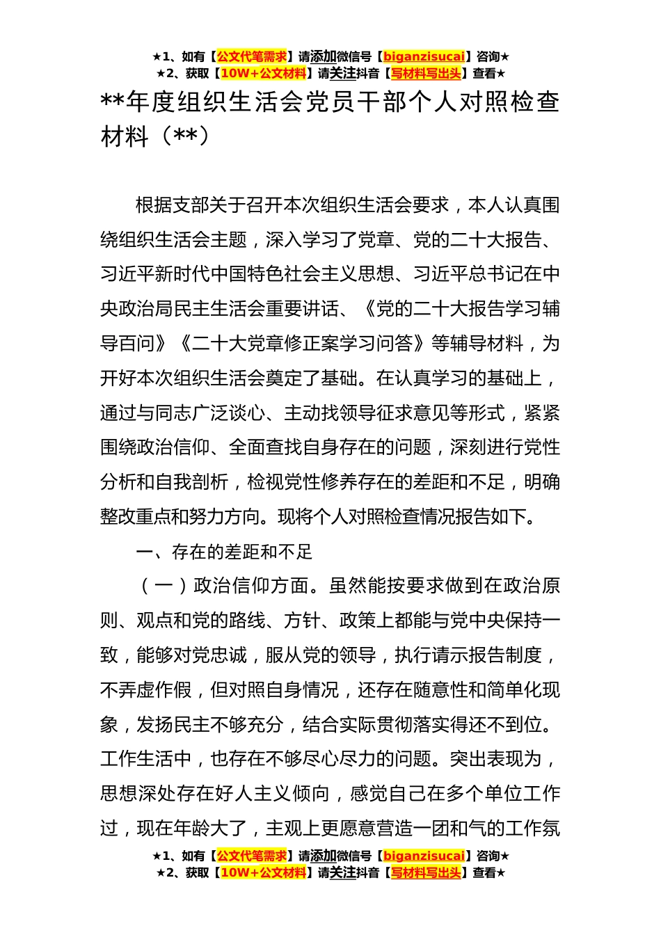 ★1、如有【公文代笔需求】请添加微信号【biganzisucai】咨询★★2、获取【10W+公文材料】请关注抖音【写材料写出头】查看★**年度组织生活会党员干部个人对照检查材料(**)根据支部关于召开本次组织生活会要求,本人认真围绕组织生活会主题,深入学习了党章、党的二十大报告、习近平新时代中国特色社会主义思想、习近平总书记在中央政治局民主生活会重要讲话、《党的二十大报告学习辅导百问》《二十大党章修正案学习问答》等辅导材料,为开好本次组织生活会奠定了基础。在认真学习的基础上,通过与同志广泛谈心、主动找领导征求意见等形式,紧紧围绕政治信仰、全面查找自身存在的问题,深刻进行党性分析和自我剖析,检视党性修养存在的差距和不足,明确整改重点和努力方向。现将个人对照检查情况报告如下。一、...
