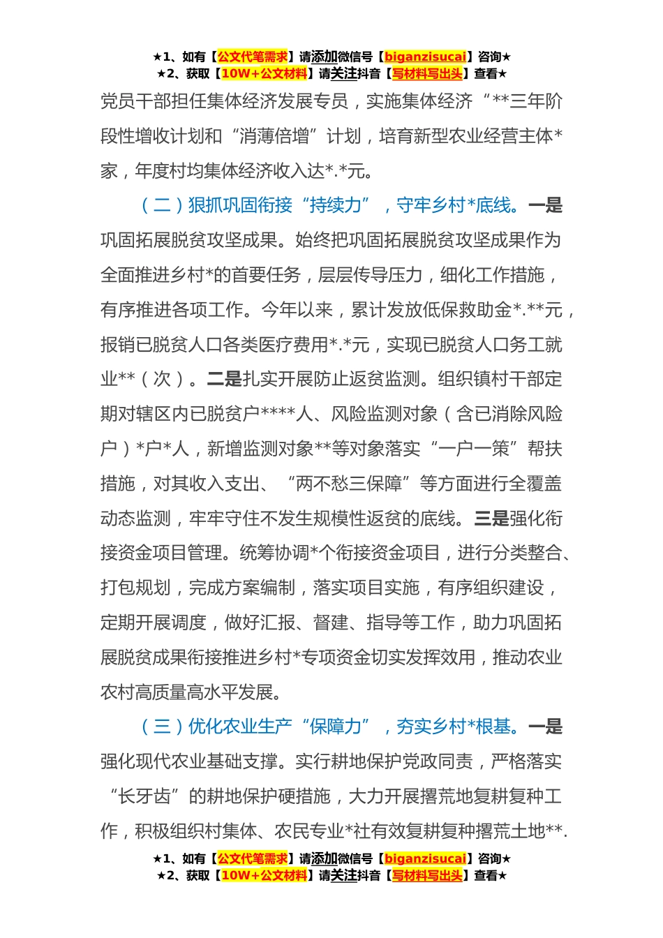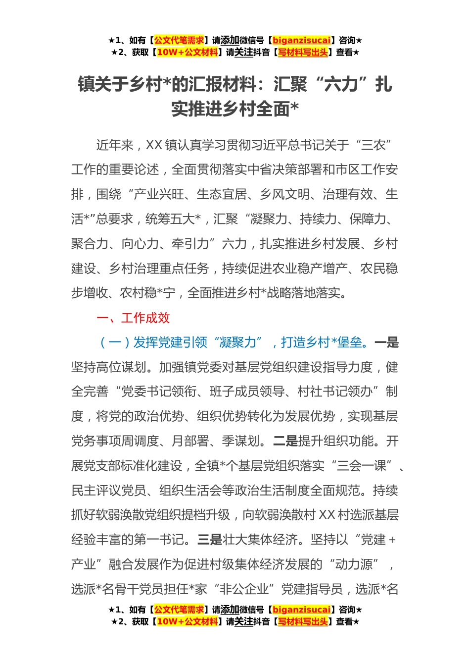 ★1、如有【公文代笔需求】请添加微信号【biganzisucai】咨询★★2、获取【10W+公文材料】请关注抖音【写材料写出头】查看★镇关于乡村*的汇报材料:汇聚“六力”扎实推进乡村全面*近年来,XX镇认真学习贯彻习近平总书记关于“三农”工作的重要论述,全面贯彻落实中省决策部署和市区工作安排,围绕“产业兴旺、生态宜居、乡风文明、治理有效、生活*”总要求,统筹五大*,汇聚“凝聚力、持续力、保障力、聚合力、向心力、牵引力”六力,扎实推进乡村发展、乡村建设、乡村治理重点任务,持续促进农业稳产增产、农民稳步增收、农村稳*宁,全面推进乡村*战略落地落实。一、工作成效(一)发挥党建引领“凝聚力”,打造乡村*堡垒。一是坚持高位谋划。加强镇党委对基层党组织建设指导力度,健全完善“党委书记领衔、班子...