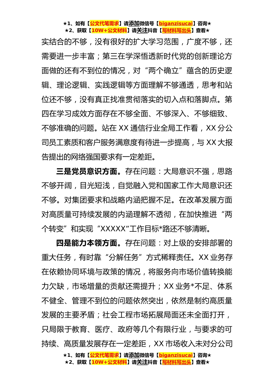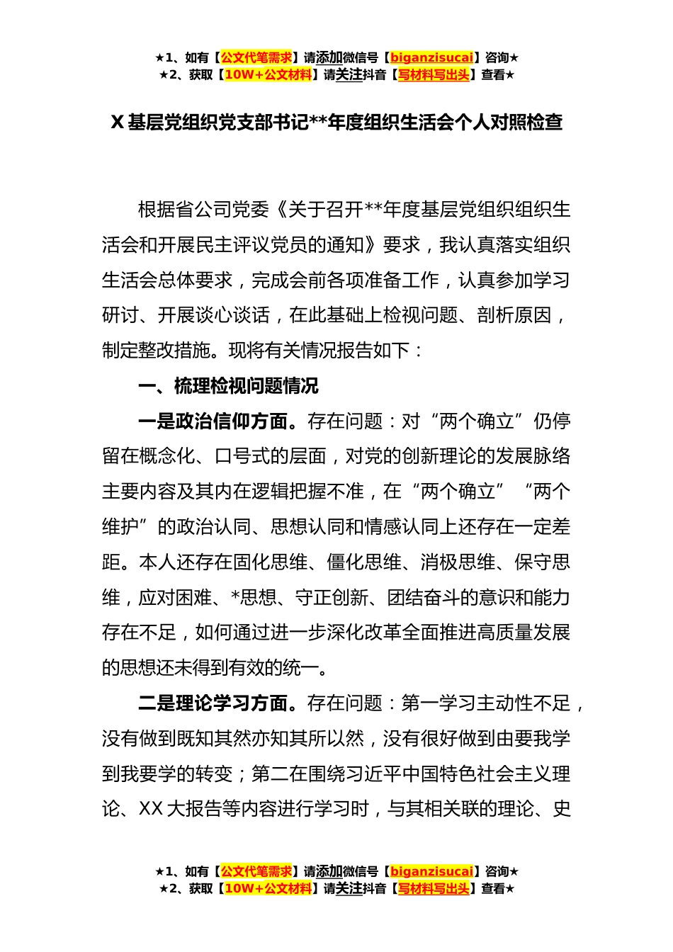 ★1、如有【公文代笔需求】请添加微信号【biganzisucai】咨询★★2、获取【10W+公文材料】请关注抖音【写材料写出头】查看★X基层党组织党支部书记**年度组织生活会个人对照检查根据省公司党委《关于召开**年度基层党组织组织生活会和开展民主评议党员的通知》要求,我认真落实组织生活会总体要求,完成会前各项准备工作,认真参加学习研讨、开展谈心谈话,在此基础上检视问题、剖析原因,制定整改措施。现将有关情况报告如下:一、梳理检视问题情况一是政治信仰方面。存在问题:对“两个确立”仍停留在概念化、口号式的层面,对党的创新理论的发展脉络主要内容及其内在逻辑把握不准,在“两个确立”“两个维护”的政治认同、思想认同和情感认同上还存在一定差距。本人还存在固化思维、僵化思维、消极思维、保守思...