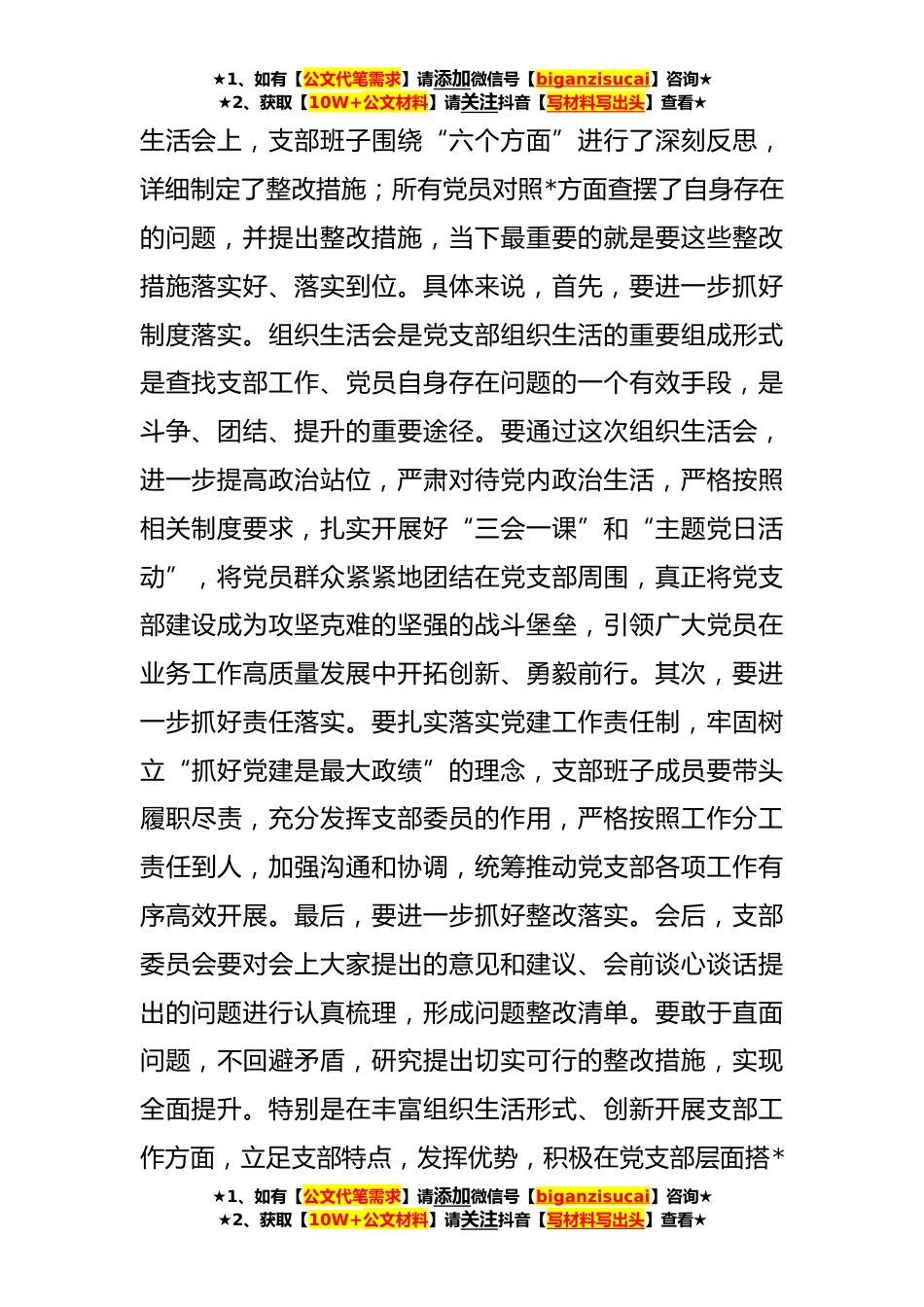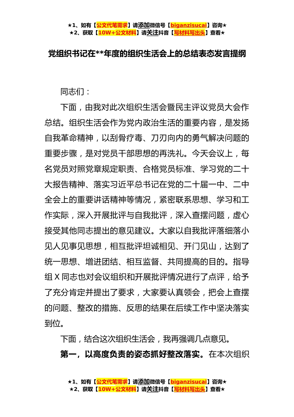★1、如有【公文代笔需求】请添加微信号【biganzisucai】咨询★★2、获取【10W+公文材料】请关注抖音【写材料写出头】查看★党组织书记在**年度的组织生活会上的总结表态发言提纲同志们:下面,由我对此次组织生活会暨民主评议党员大会作总结。组织生活会作为党内政治生活的重要内容,是发扬自我革命精神,以刮骨疗毒、刀刃向内的勇气解决问题的重要步骤,是对党员干部思想的再洗礼。今天会议上,每名党员对照党章规定职责、合格党员标准、学习党的二十大报告精神、落实习近平总书记在党的二十届一中、二中全会上的重要讲话精神等情况,紧密联系思想、学习和工作实际,深入开展批评与自我批评,深入查摆问题,虚心接受其他同志提出的意见建议。大家以自我批评落细落小见人见事见思想,相互批评坦诚相见、开门见山...