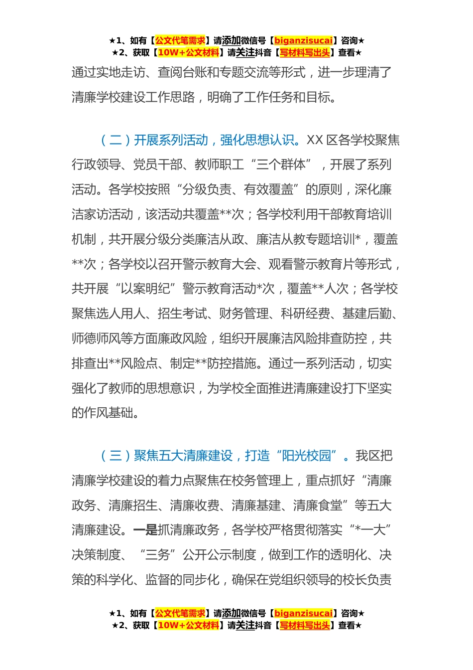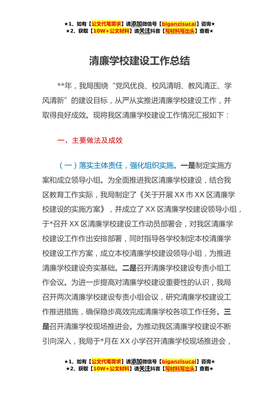 ★1、如有【公文代笔需求】请添加微信号【biganzisucai】咨询★★2、获取【10W+公文材料】请关注抖音【写材料写出头】查看★清廉学校建设工作总结**年,我局围绕“党风优良、校风清明、教风清正、学风清新”的建设目标,从严从实推进清廉学校建设工作,并取得良好成效。现将我区清廉学校建设工作情况汇报如下:一、主要做法及成效(一)落实主体责任,强化组织实施。一是制定实施方案和成立领导小组。为全面推进我区清廉学校建设,结合我区教育工作实际,我局制定了《关于开展XX市XX区清廉学校建设的实施方案》,并成立了XX区清廉学校建设领导小组,于*召开XX区清廉学校建设工作动员部署会,对我区清廉学校建设工作作出安排部署,同时指导各学校制定本校清廉学校建设工作方案,成立本校清廉学校建设领导小组,为推...
