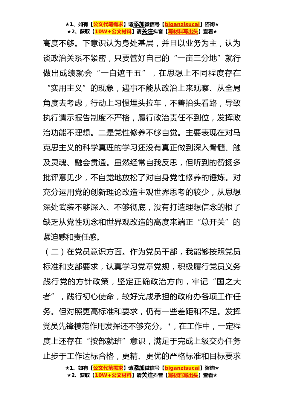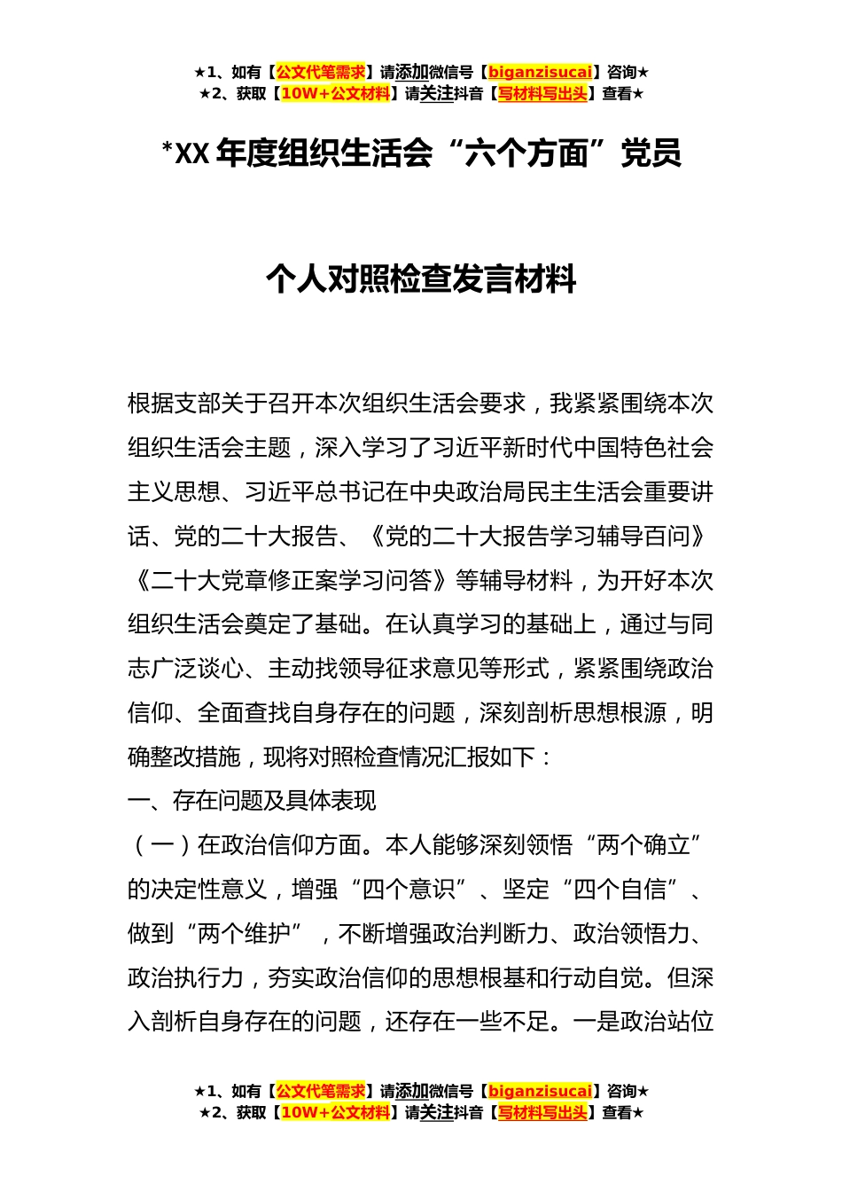 ★1、如有【公文代笔需求】请添加微信号【biganzisucai】咨询★★2、获取【10W+公文材料】请关注抖音【写材料写出头】查看★*XX年度组织生活会“六个方面”党员个人对照检查发言材料根据支部关于召开本次组织生活会要求,我紧紧围绕本次组织生活会主题,深入学习了习近平新时代中国特色社会主义思想、习近平总书记在中央政治局民主生活会重要讲话、党的二十大报告、《党的二十大报告学习辅导百问》《二十大党章修正案学习问答》等辅导材料,为开好本次组织生活会奠定了基础。在认真学习的基础上,通过与同志广泛谈心、主动找领导征求意见等形式,紧紧围绕政治信仰、全面查找自身存在的问题,深刻剖析思想根源,明确整改措施,现将对照检查情况汇报如下:一、存在问题及具体表现(一)在政治信仰方面。本人能够深刻...