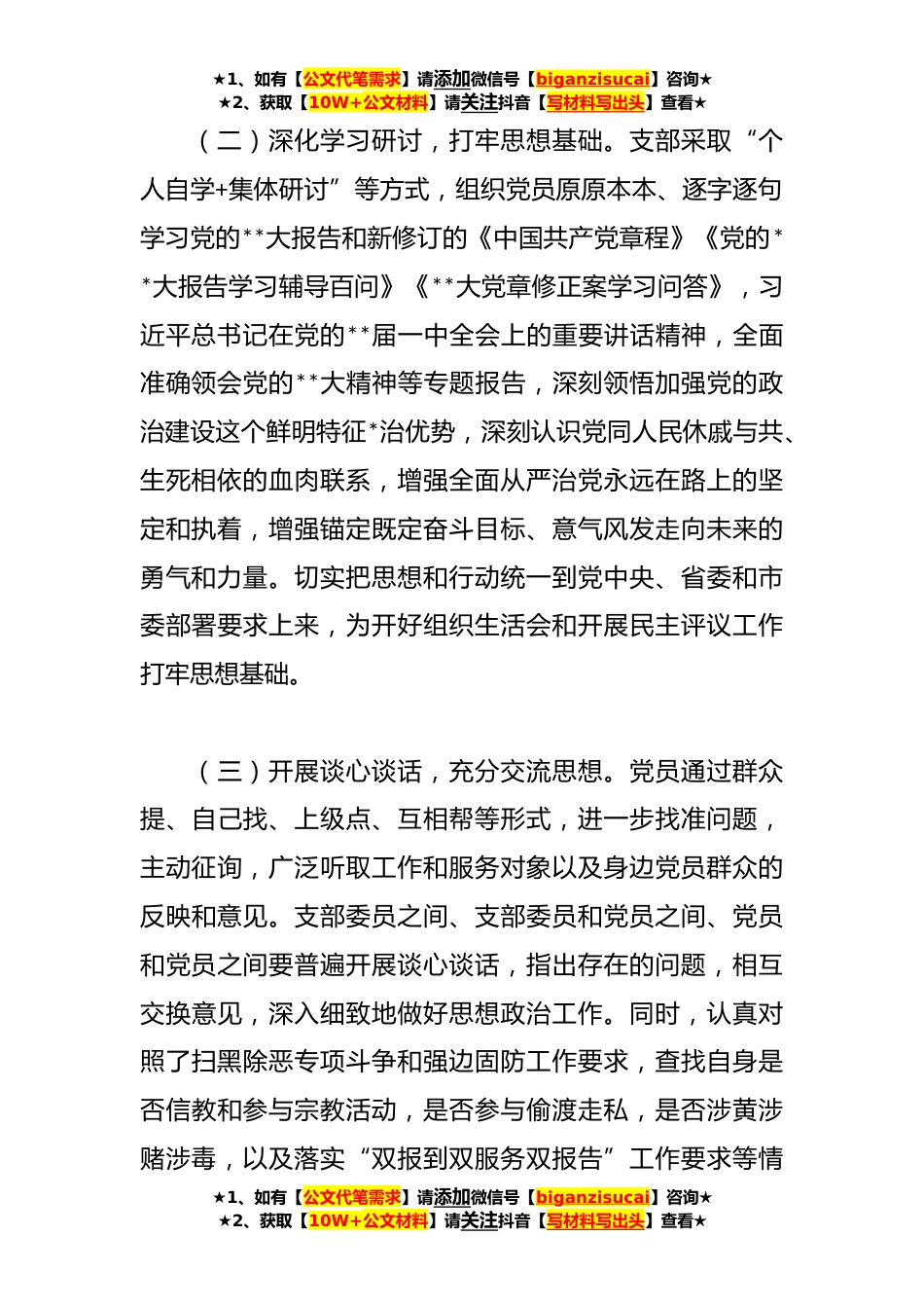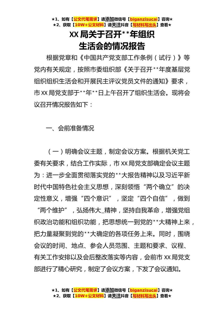 ★1、如有【公文代笔需求】请添加微信号【biganzisucai】咨询★★2、获取【10W+公文材料】请关注抖音【写材料写出头】查看★XX局关于召开**年组织生活会的情况报告根据党章和《中国共产党支部工作条例(试行)》等党内有关规定,按照市委组织部《关于召开**年度基层党组织组织生活会和开展民主评议党员文件的通知》要求,市XX局党支部于**年**日上午召开了组织生活会。现将会议召开情况报告如下:一、会前准备情况(一)明确会议主题,制定会议方案。根据机关党工委有关要求,结合工作实际,市XX局党支部确定会议主题为:进一步全面贯彻落实党的**大报告精神以及习近平新时代中国特色社会主义思想,深刻领悟“两个确立”的决定性意义,增强“四个意识”,坚定“四个自信”,做到“两个维护”,弘扬伟大_精神,坚持...