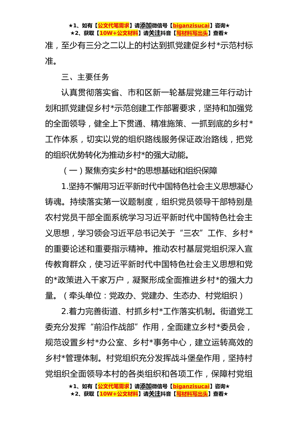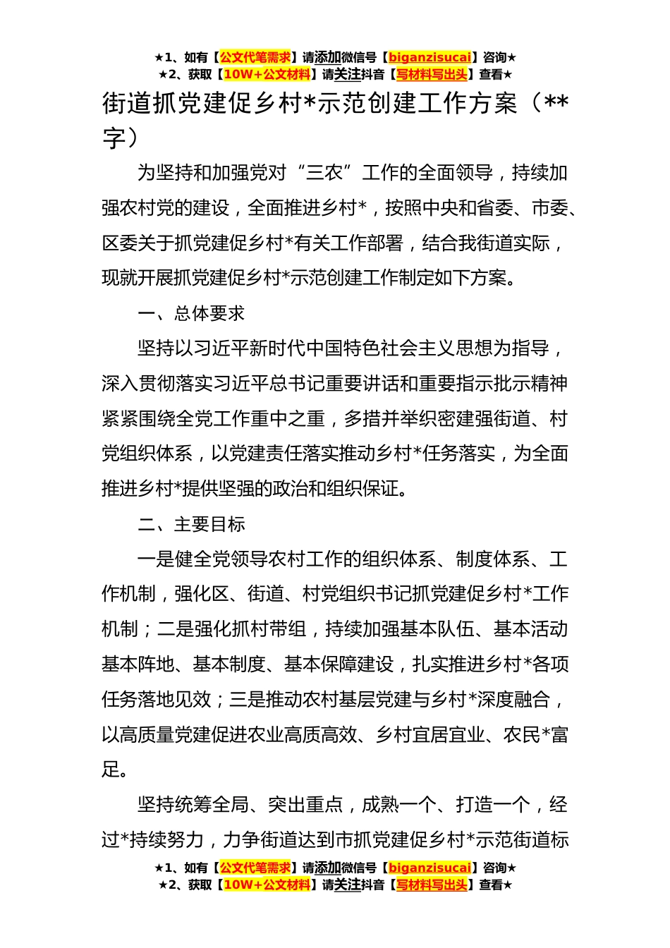 ★1、如有【公文代笔需求】请添加微信号【biganzisucai】咨询★★2、获取【10W+公文材料】请关注抖音【写材料写出头】查看★街道抓党建促乡村*示范创建工作方案(**字)为坚持和加强党对“三农”工作的全面领导,持续加强农村党的建设,全面推进乡村*,按照中央和省委、市委、区委关于抓党建促乡村*有关工作部署,结合我街道实际,现就开展抓党建促乡村*示范创建工作制定如下方案。一、总体要求坚持以习近平新时代中国特色社会主义思想为指导,深入贯彻落实习近平总书记重要讲话和重要指示批示精神紧紧围绕全党工作重中之重,多措并举织密建强街道、村党组织体系,以党建责任落实推动乡村*任务落实,为全面推进乡村*提供坚强的政治和组织保证。二、主要目标一是健全党领导农村工作的组织体系、制度体系、工作机制...