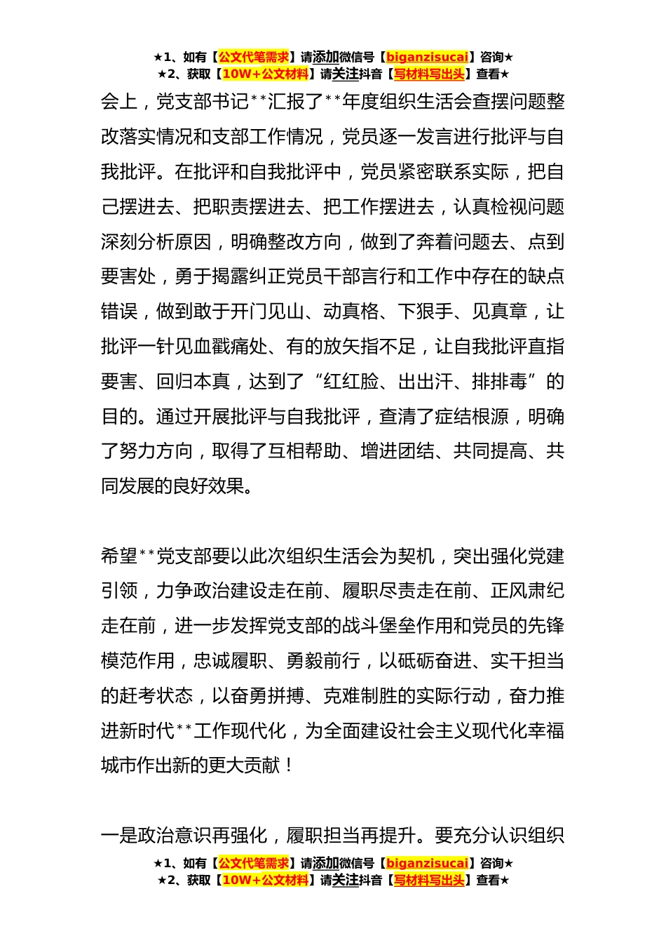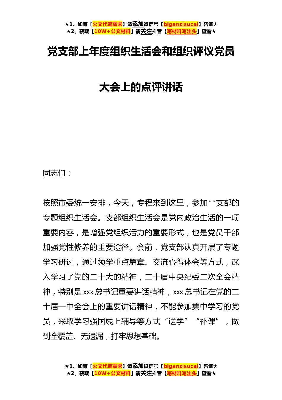 ★1、如有【公文代笔需求】请添加微信号【biganzisucai】咨询★★2、获取【10W+公文材料】请关注抖音【写材料写出头】查看★党支部上年度组织生活会和组织评议党员大会上的点评讲话同志们:按照市委统一安排,今天,专程来到这里,参加**支部的专题组织生活会。支部组织生活会是党内政治生活的一项重要内容,是增强党组织活力的重要形式,也是党员干部加强党性修养的重要途径。会前,党支部认真开展了专题学习研讨,通过领学重点篇章、交流心得体会等方式,深入学习了党的二十大的精神,二十届中央纪委二次全会精神,特别是xxx总书记重要讲话精神,xxx总书记在党的二十届一中全会上的重要讲话精神,不能参加集中学习的党员,采取学习强国线上辅导等方式“送学”“补课”,做到全覆盖、无遗漏,打牢思想基础。★1、...