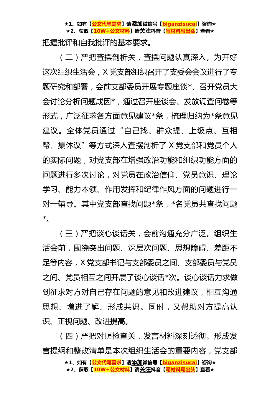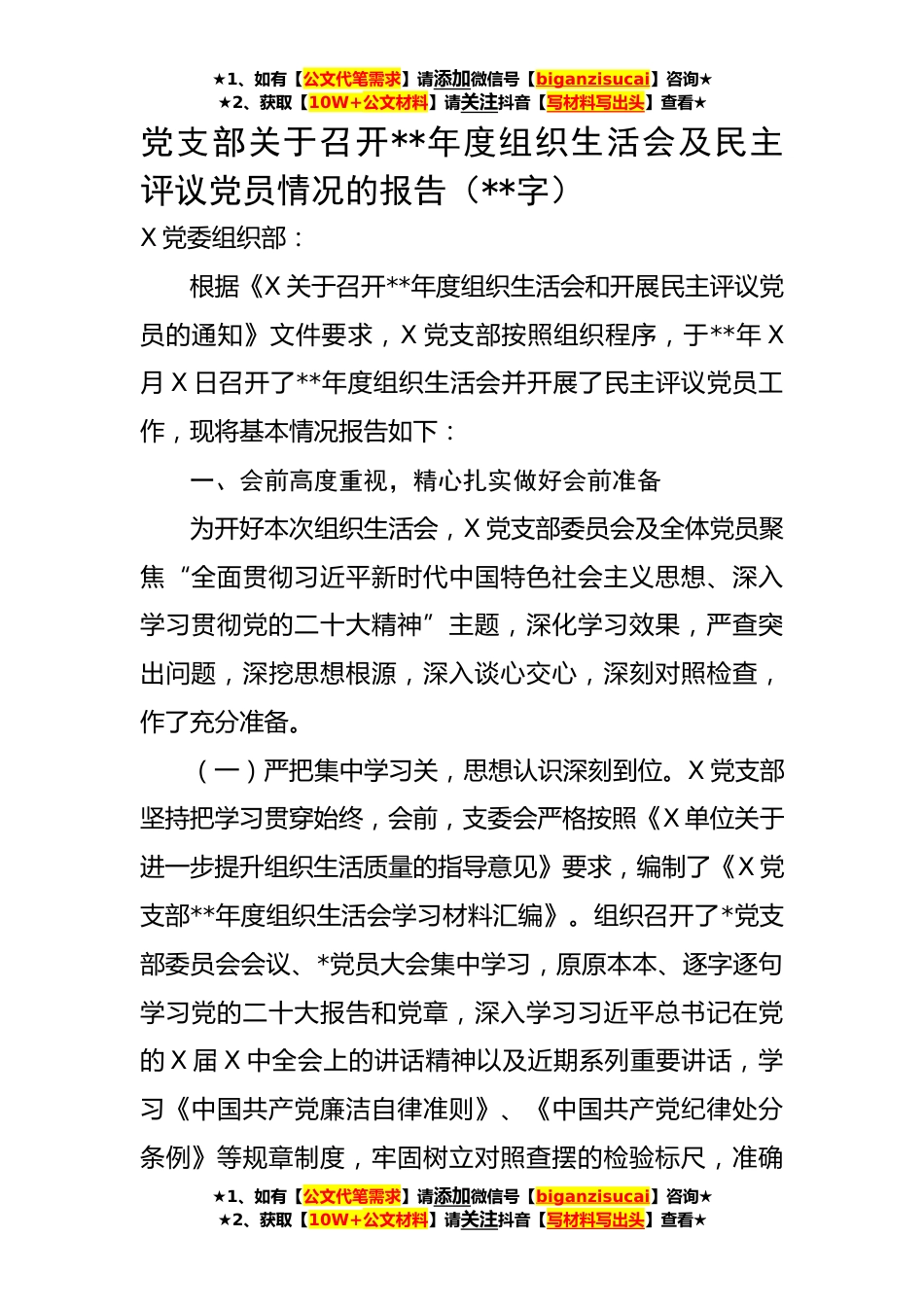 ★1、如有【公文代笔需求】请添加微信号【biganzisucai】咨询★★2、获取【10W+公文材料】请关注抖音【写材料写出头】查看★党支部关于召开**年度组织生活会及民主评议党员情况的报告(**字)X党委组织部:根据《X关于召开**年度组织生活会和开展民主评议党员的通知》文件要求,X党支部按照组织程序,于**年X月X日召开了**年度组织生活会并开展了民主评议党员工作,现将基本情况报告如下:一、会前高度重视,精心扎实做好会前准备为开好本次组织生活会,X党支部委员会及全体党员聚焦“全面贯彻习近平新时代中国特色社会主义思想、深入学习贯彻党的二十大精神”主题,深化学习效果,严查突出问题,深挖思想根源,深入谈心交心,深刻对照检查,作了充分准备。(一)严把集中学习关,思想认识深刻到位。X党支部坚持把...