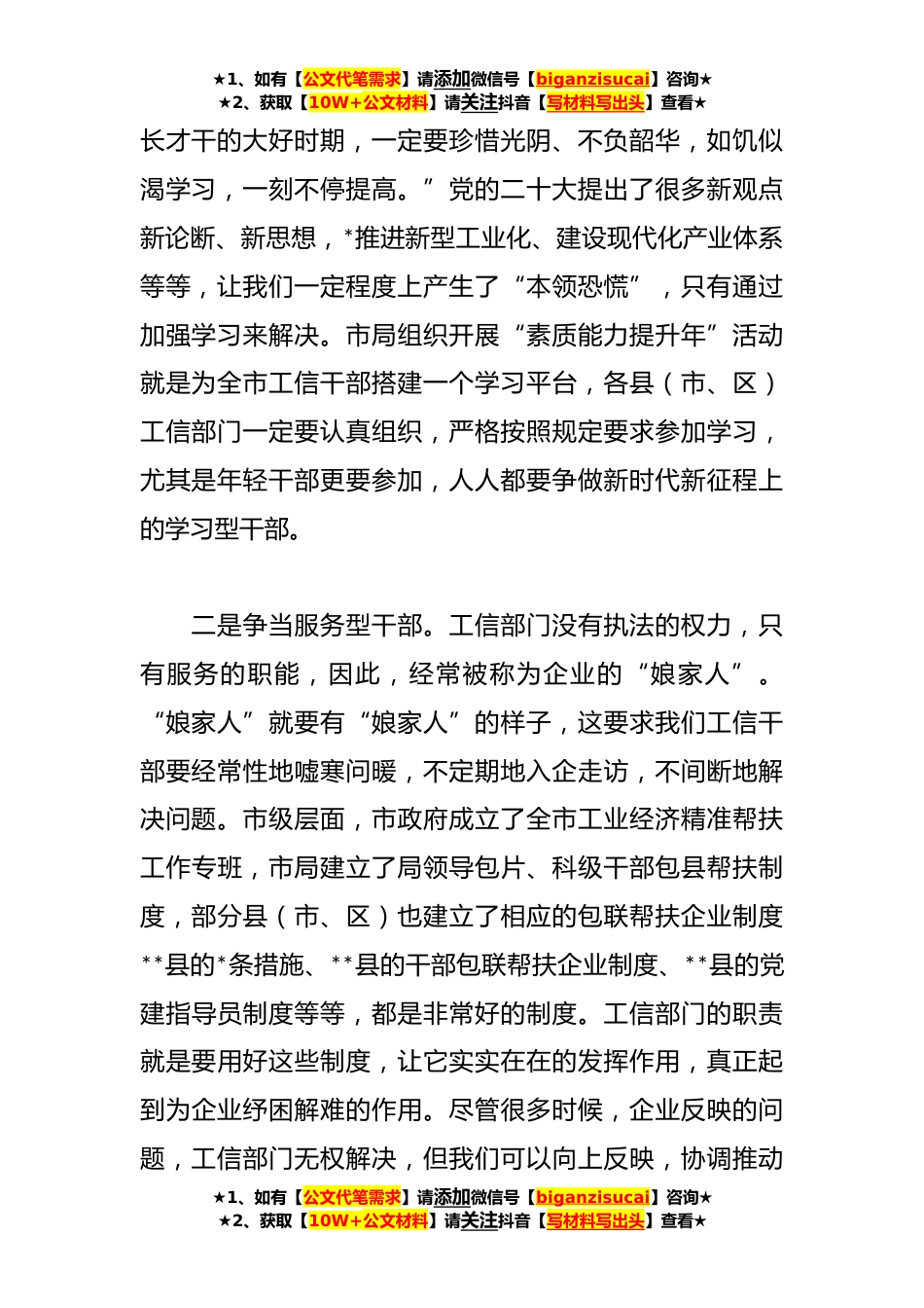 ★1、如有【公文代笔需求】请添加微信号【biganzisucai】咨询★★2、获取【10W+公文材料】请关注抖音【写材料写出头】查看★在“素质能力提升年”活动开班式上的主持讲话稿同志们:在今年全市工业和信息化工作会议上,我们提出要全面提升工信干部服务企业的能力,大力开展全市工信干部“素质能力提升年”活动。经过前期紧张筹备,今天我们举办第一期培训班,今后每月开展两次培训,培训主题紧紧围绕工业发展各项重点工作来进行。一会儿**局长还要围绕工业基础知识给大家授课,在此,我就开展好“素质能力提升年”活动,简要讲四点意见,概括来说就是“提升素质能力,争当‘四型’干部”。一是争当学习型干部。习近平总书记强调领导干部需要增强的八项本领,首要的就是学习本领。他强调:“我们处在前所未有的变革...