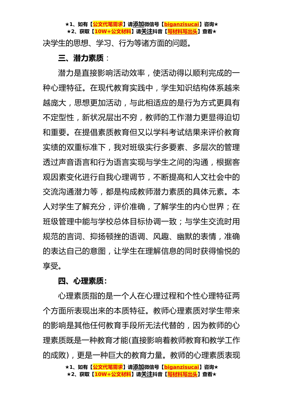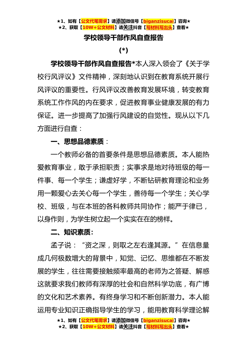 ★1、如有【公文代笔需求】请添加微信号【biganzisucai】咨询★★2、获取【10W+公文材料】请关注抖音【写材料写出头】查看★学校领导干部作风自查报告(*)学校领导干部作风自查报告*本人深入领会了《关于学校行风评议》文件精神,深刻地认识到在教育系统开展行风评议的重要性。行风评议改善教育发展环境,转变教育系统工作作风的内在要求,促进教育事业健康发展的有力保证。进一步提高了加强行风建设的自觉性。现从以下几方面进行自查:一、思想品德素质:一个教师必备的首要条件是思想品德素质。本人能热爱教育事业,敢于承担职责;实事求是地对待班级的每一件事、每一个学生;谦虚好学,不断钻研教育理论和业务用一颗爱心去关心每一个学生,善待每一个学生;关心学校、班级,与在本班的各科教师共同协作;能严于...