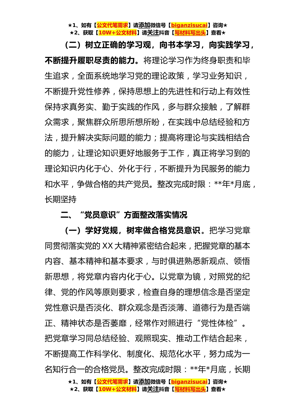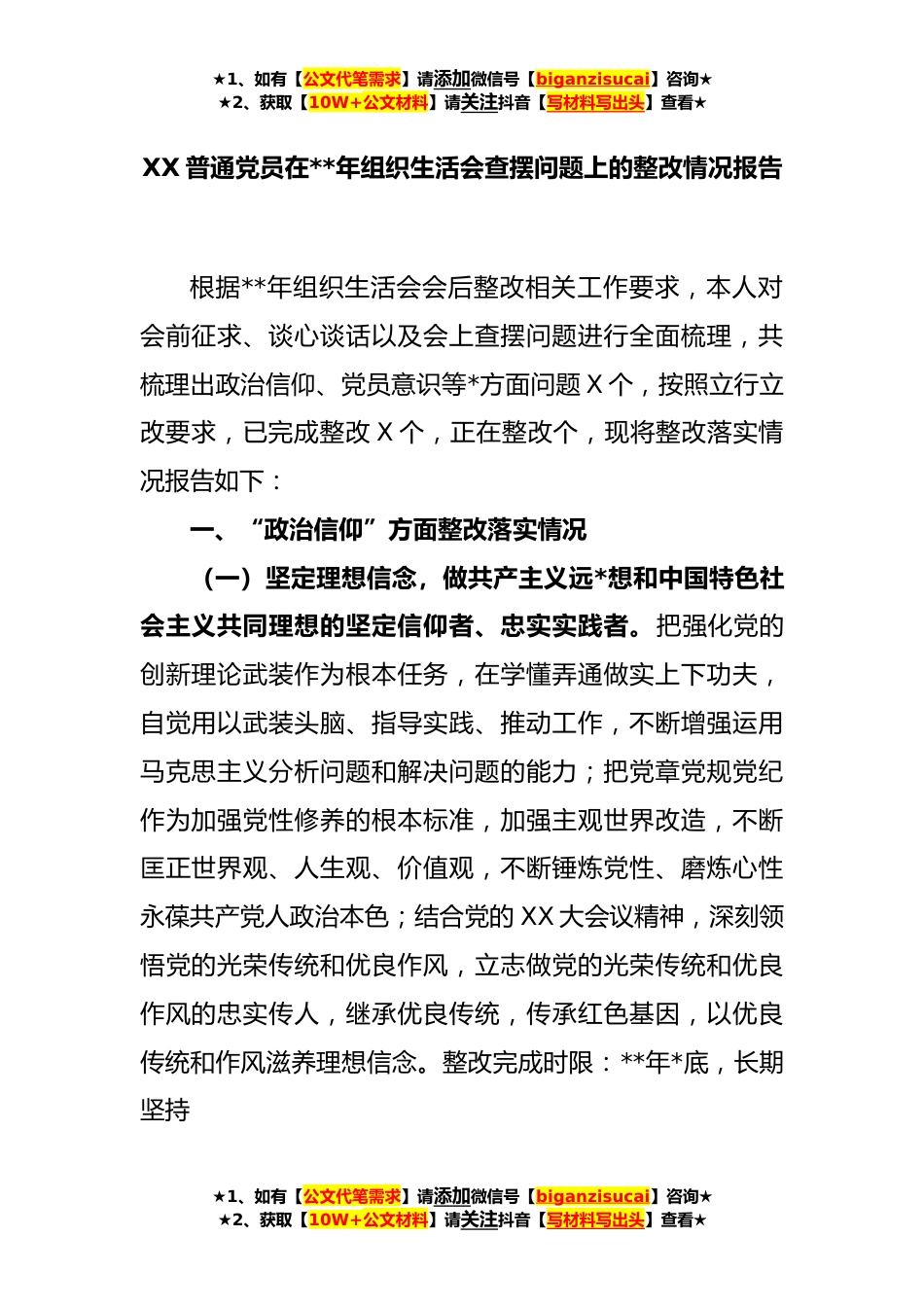 ★1、如有【公文代笔需求】请添加微信号【biganzisucai】咨询★★2、获取【10W+公文材料】请关注抖音【写材料写出头】查看★XX普通党员在**年组织生活会查摆问题上的整改情况报告根据**年组织生活会会后整改相关工作要求,本人对会前征求、谈心谈话以及会上查摆问题进行全面梳理,共梳理出政治信仰、党员意识等*方面问题X个,按照立行立改要求,已完成整改X个,正在整改个,现将整改落实情况报告如下:一、“政治信仰”方面整改落实情况(一)坚定理想信念,做共产主义远*想和中国特色社会主义共同理想的坚定信仰者、忠实实践者。把强化党的创新理论武装作为根本任务,在学懂弄通做实上下功夫,自觉用以武装头脑、指导实践、推动工作,不断增强运用马克思主义分析问题和解决问题的能力;把党章党规党纪作为加强党...