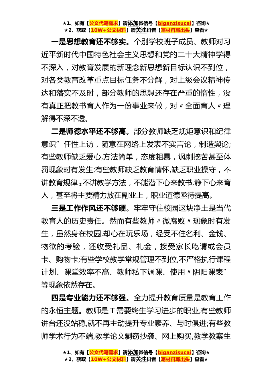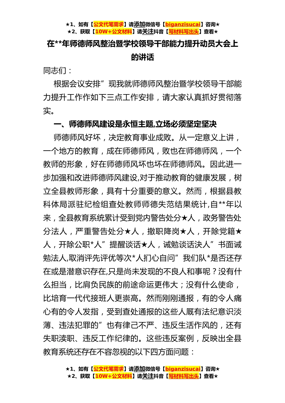 ★1、如有【公文代笔需求】请添加微信号【biganzisucai】咨询★★2、获取【10W+公文材料】请关注抖音【写材料写出头】查看★在**年师德师风整治暨学校领导干部能力提升动员大会上的讲话同志们:根据会议安排”现我就师德师风整治暨学校领导干部能力提升工作作如下三点工作安排,请大家认真抓好贯彻落实。一、师德师风建设是永恒主题,立场必须坚定坚决师德师风好坏,决定教育事业成败。从一定意义上讲,一个地方的教育,成在师德师风,败也在师德师风,一个教师的形象,好在师德师风坏也坏在师德师风。因此进一步加强和改进师德师风建设,对于推动教育的健康发展,树立全县教师形象,具有十分重要的意义。然而,根据县教科体局派驻纪检组查处教师师德失范结果统计,自**年以来,全县教育系统累计受到党内警告处分★人...