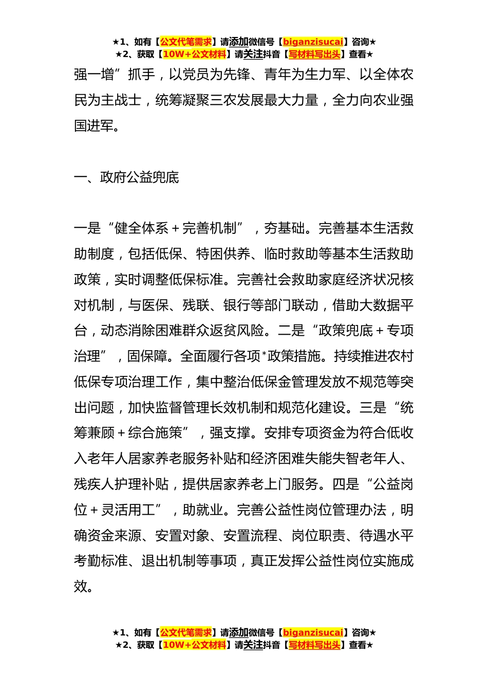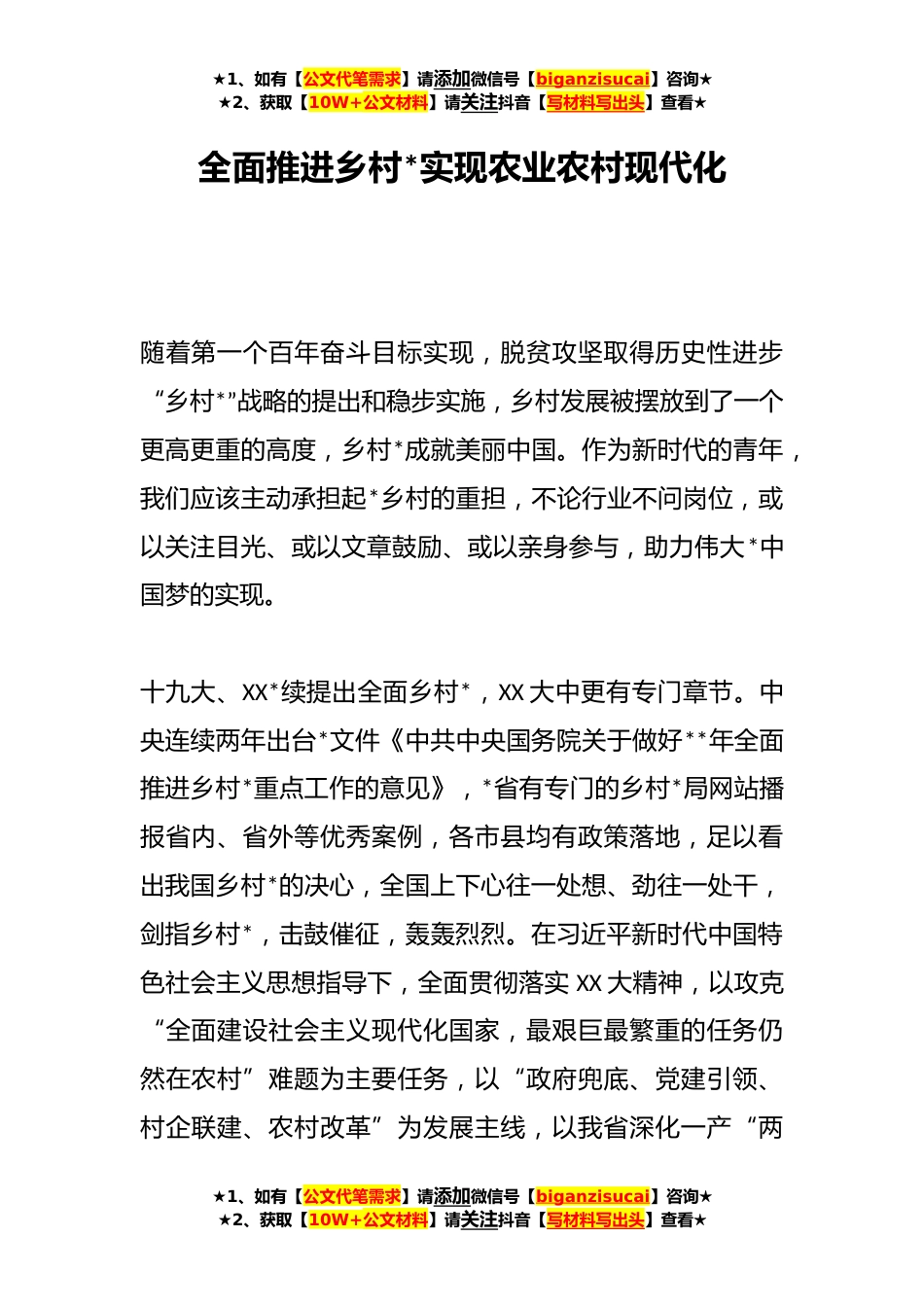 ★1、如有【公文代笔需求】请添加微信号【biganzisucai】咨询★★2、获取【10W+公文材料】请关注抖音【写材料写出头】查看★全面推进乡村*实现农业农村现代化随着第一个百年奋斗目标实现,脱贫攻坚取得历史性进步“乡村*”战略的提出和稳步实施,乡村发展被摆放到了一个更高更重的高度,乡村*成就美丽中国。作为新时代的青年,我们应该主动承担起*乡村的重担,不论行业不问岗位,或以关注目光、或以文章鼓励、或以亲身参与,助力伟大*中国梦的实现。十九大、XX*续提出全面乡村*,XX大中更有专门章节。中央连续两年出台*文件《中共中央国务院关于做好**年全面推进乡村*重点工作的意见》,*省有专门的乡村*局网站播报省内、省外等优秀案例,各市县均有政策落地,足以看出我国乡村*的决心,全国上下心往一处想、劲往...