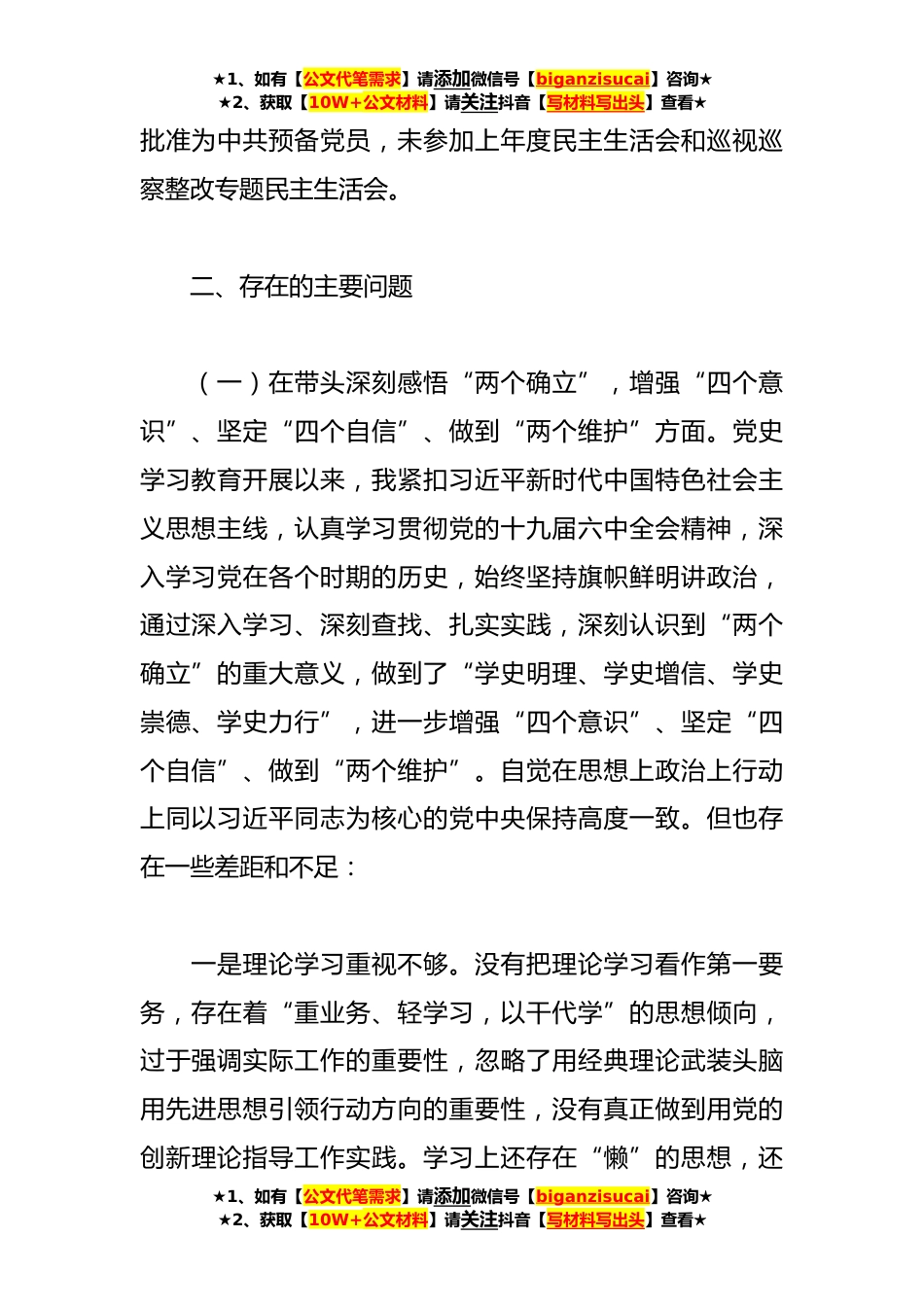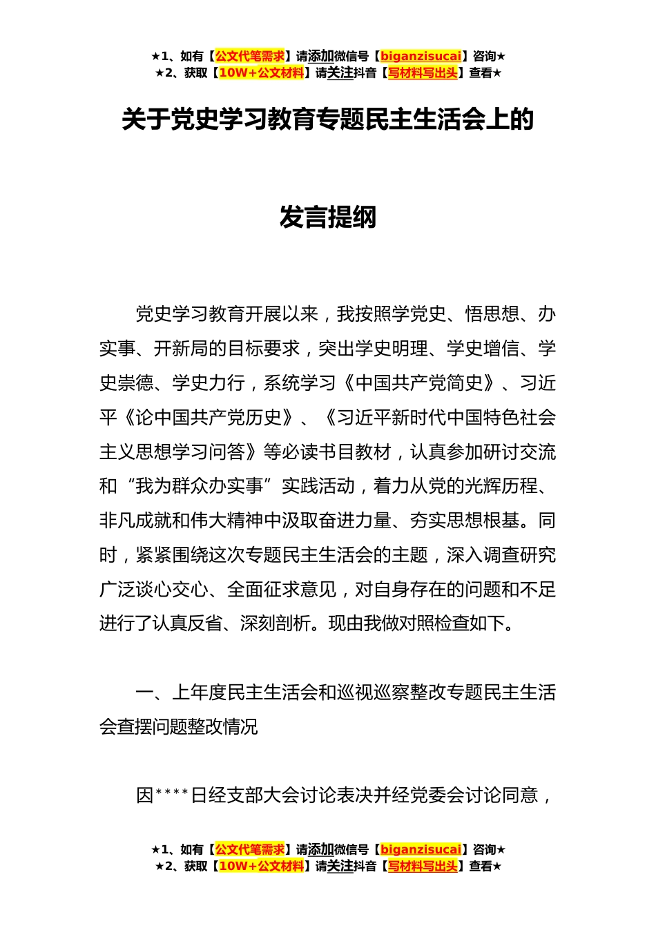 ★1、如有【公文代笔需求】请添加微信号【biganzisucai】咨询★★2、获取【10W+公文材料】请关注抖音【写材料写出头】查看★关于党史学习教育专题民主生活会上的发言提纲党史学习教育开展以来,我按照学党史、悟思想、办实事、开新局的目标要求,突出学史明理、学史增信、学史崇德、学史力行,系统学习《中国共产党简史》、习近平《论中国共产党历史》、《习近平新时代中国特色社会主义思想学习问答》等必读书目教材,认真参加研讨交流和“我为群众办实事”实践活动,着力从党的光辉历程、非凡成就和伟大精神中汲取奋进力量、夯实思想根基。同时,紧紧围绕这次专题民主生活会的主题,深入调查研究广泛谈心交心、全面征求意见,对自身存在的问题和不足进行了认真反省、深刻剖析。现由我做对照检查如下。一、上年度...