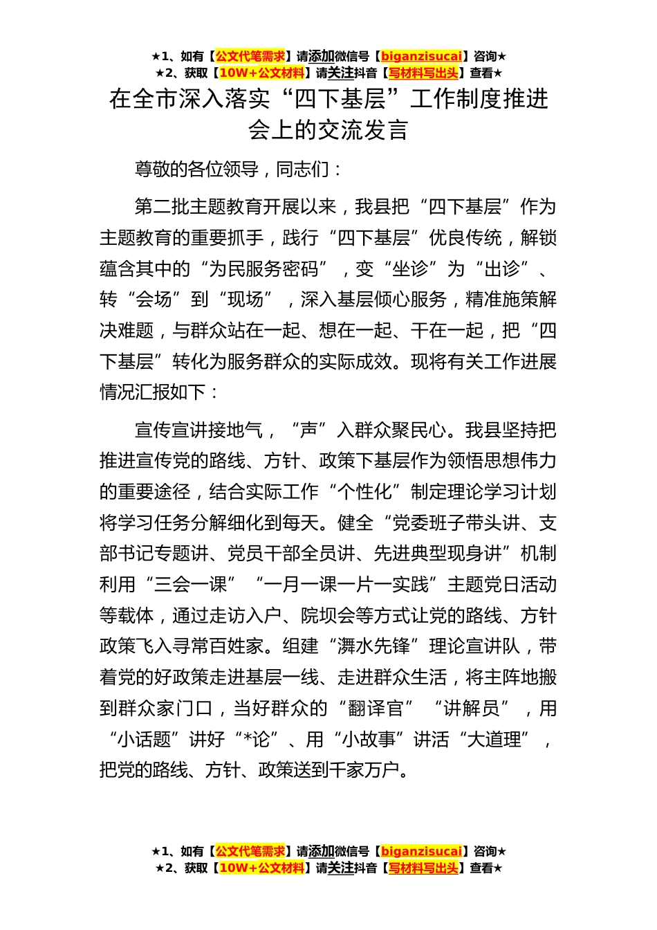 ★1、如有【公文代笔需求】请添加微信号【biganzisucai】咨询★★2、获取【10W+公文材料】请关注抖音【写材料写出头】查看★★1、如有【公文代笔需求】请添加微信号【biganzisucai】咨询★★2、获取【10W+公文材料】请关注抖音【写材料写出头】查看★★1、如有【公文代笔需求】请添加微信号【biganzisucai】咨询★★2、获取【10W+公文材料】请关注抖音【写材料写出头】查看★在全市深入落实“四下基层”工作制度推进会上的交流发言尊敬的各位领导,同志们:第二批主题教育开展以来,我县把“四下基层”作为主题教育的重要抓手,践行“四下基层”优良传统,解锁蕴含其中的“为民服务密码”,变“坐诊”为“出诊”、转“会场”到“现场”,深入基层倾心服务,精准施策解决难题,与群众站在一起、想在一起、干在一起...