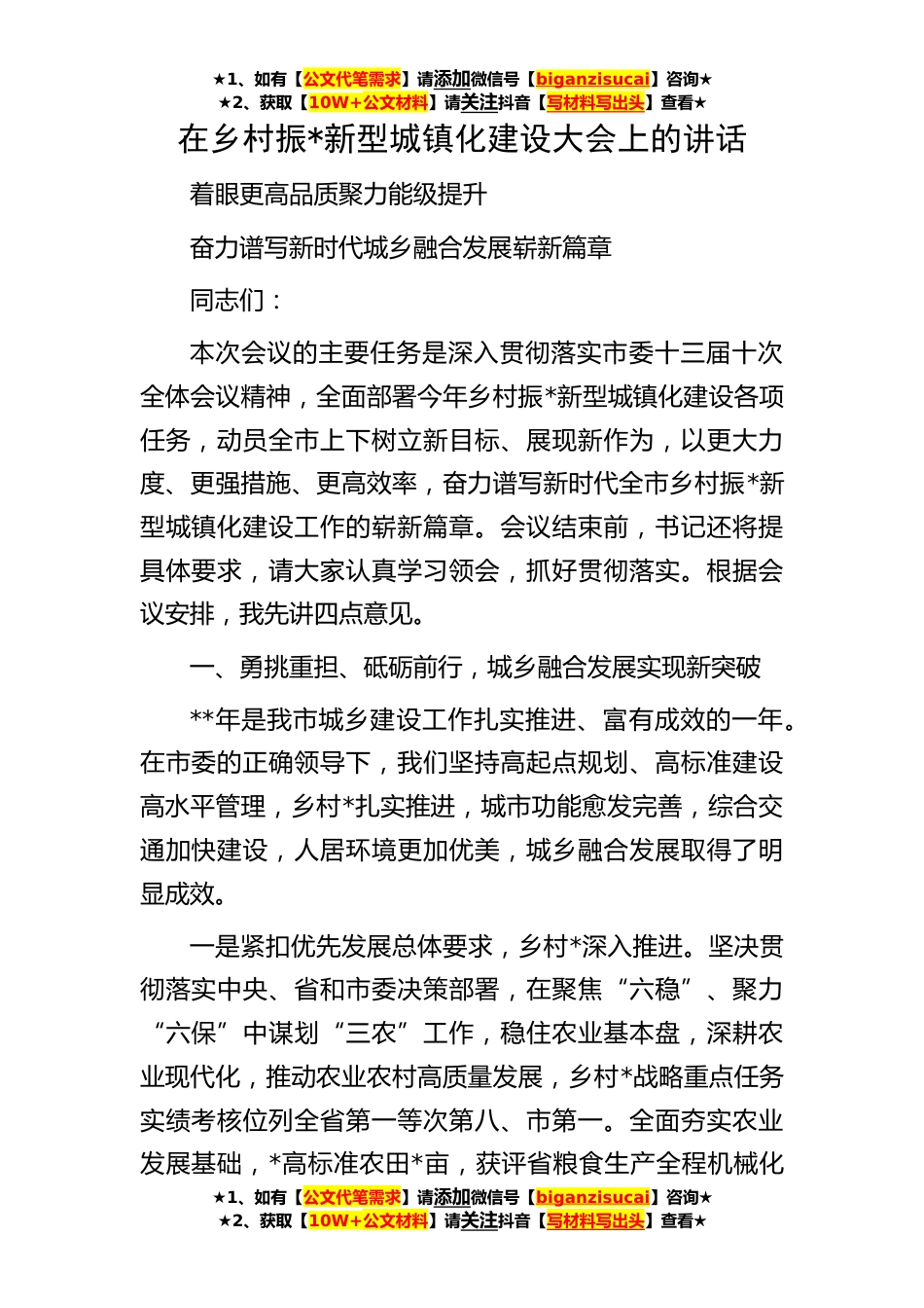 ★1、如有【公文代笔需求】请添加微信号【biganzisucai】咨询★★2、获取【10W+公文材料】请关注抖音【写材料写出头】查看★★1、如有【公文代笔需求】请添加微信号【biganzisucai】咨询★★2、获取【10W+公文材料】请关注抖音【写材料写出头】查看★★1、如有【公文代笔需求】请添加微信号【biganzisucai】咨询★★2、获取【10W+公文材料】请关注抖音【写材料写出头】查看★在乡村振*新型城镇化建设大会上的讲话着眼更高品质聚力能级提升奋力谱写新时代城乡融合发展崭新篇章同志们:本次会议的主要任务是深入贯彻落实市委十三届十次全体会议精神,全面部署今年乡村振*新型城镇化建设各项任务,动员全市上下树立新目标、展现新作为,以更大力度、更强措施、更高效率,奋力谱写新时代全市乡村振*新型城镇化建设工作...