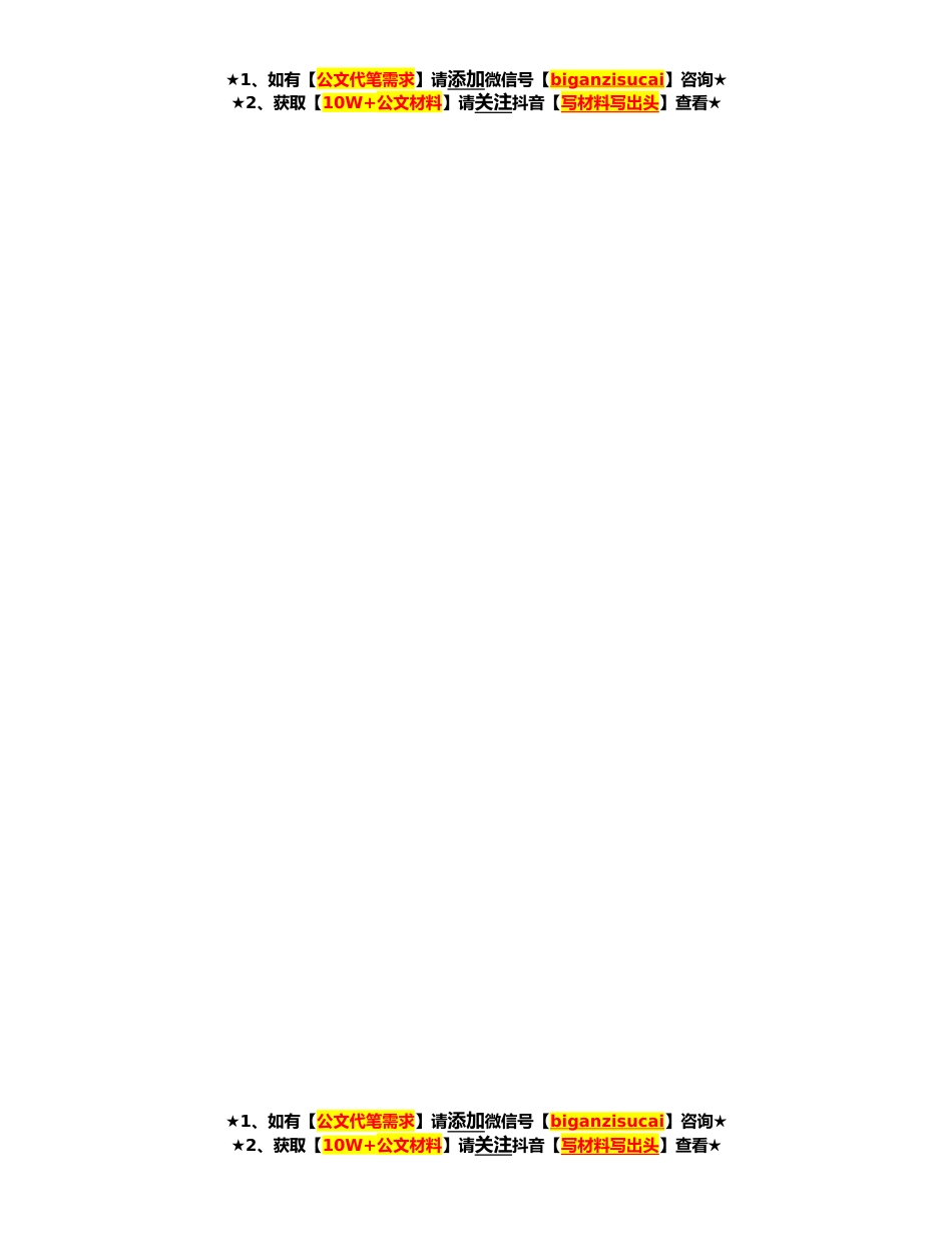 ★1、如有【公文代笔需求】请添加微信号【biganzisucai】咨询★★2、获取【10W+公文材料】请关注抖音【写材料写出头】查看★★1、如有【公文代笔需求】请添加微信号【biganzisucai】咨询★★2、获取【10W+公文材料】请关注抖音【写材料写出头】查看★★1、如有【公文代笔需求】请添加微信号【biganzisucai】咨询★★2、获取【10W+公文材料】请关注抖音【写材料写出头】查看★县委组织部部长**年度主题教育专题民主生活会对照检查材料根据关于开好**年度专题民主生活会的相关通知要求,本人聚焦“学思想、强党性、重实践、建新功”总要求,在深入学习研讨、广泛征求意见、扎实开展谈心谈话的基础上,对照“理论学习、政治素质、能力本领、担当作为工作作风、廉洁自律”*方面查摆自身存在的不足,深刻剖析产生问题的...