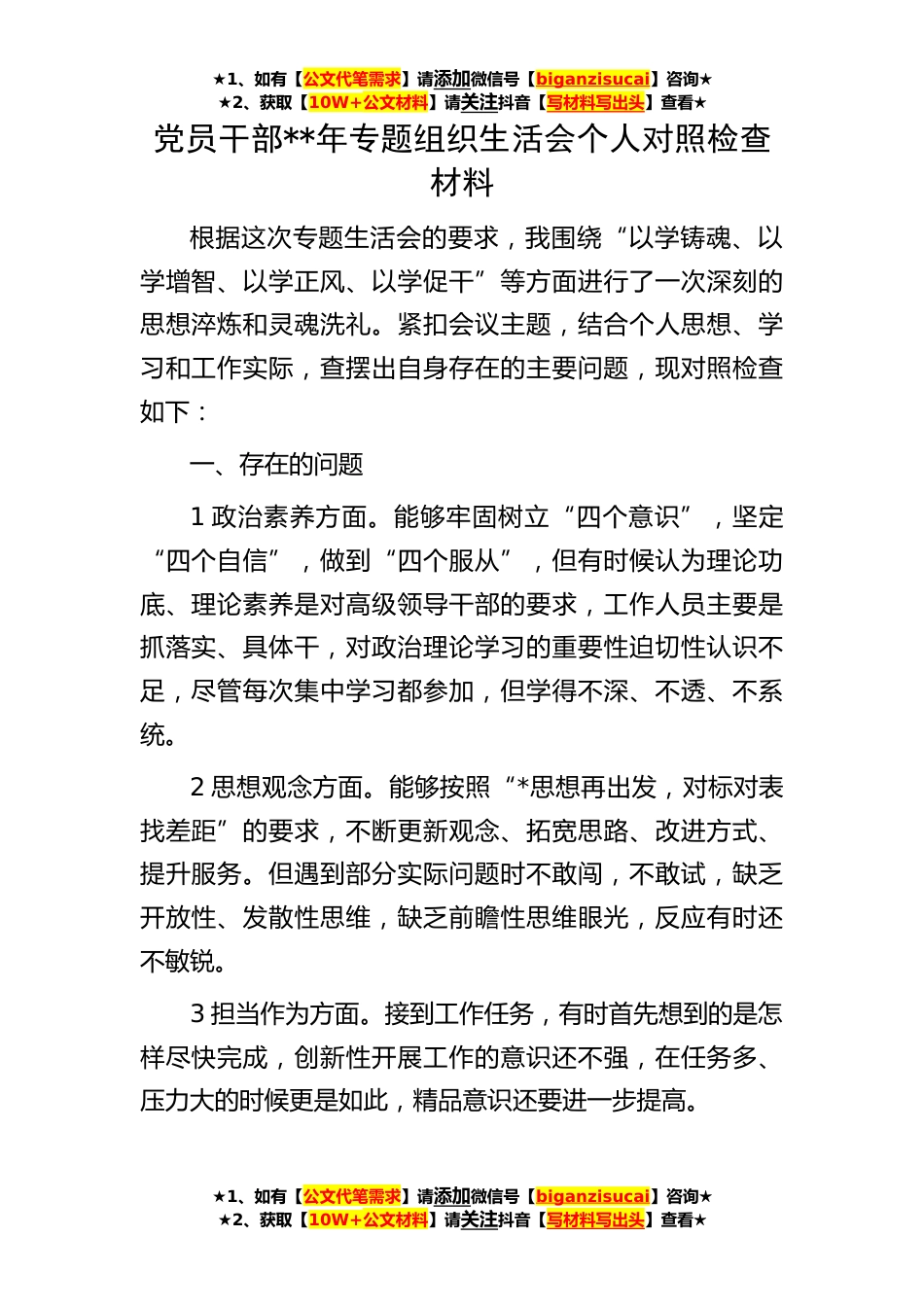 ★1、如有【公文代笔需求】请添加微信号【biganzisucai】咨询★★2、获取【10W+公文材料】请关注抖音【写材料写出头】查看★★1、如有【公文代笔需求】请添加微信号【biganzisucai】咨询★★2、获取【10W+公文材料】请关注抖音【写材料写出头】查看★★1、如有【公文代笔需求】请添加微信号【biganzisucai】咨询★★2、获取【10W+公文材料】请关注抖音【写材料写出头】查看★党员干部**年专题组织生活会个人对照检查材料根据这次专题生活会的要求,我围绕“以学铸魂、以学增智、以学正风、以学促干”等方面进行了一次深刻的思想淬炼和灵魂洗礼。紧扣会议主题,结合个人思想、学习和工作实际,查摆出自身存在的主要问题,现对照检查如下:一、存在的问题1政治素养方面。能够牢固树立“四个意识”,坚定“四个自信”...