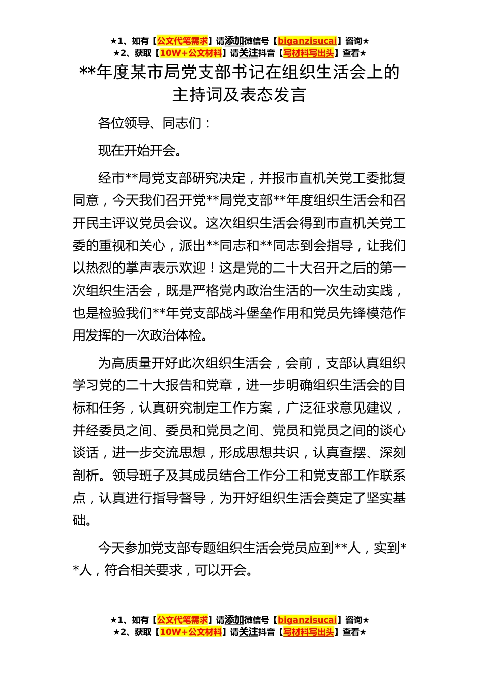 ★1、如有【公文代笔需求】请添加微信号【biganzisucai】咨询★★2、获取【10W+公文材料】请关注抖音【写材料写出头】查看★★1、如有【公文代笔需求】请添加微信号【biganzisucai】咨询★★2、获取【10W+公文材料】请关注抖音【写材料写出头】查看★★1、如有【公文代笔需求】请添加微信号【biganzisucai】咨询★★2、获取【10W+公文材料】请关注抖音【写材料写出头】查看★**年度某市局党支部书记在组织生活会上的主持词及表态发言各位领导、同志们:现在开始开会。经市**局党支部研究决定,并报市直机关党工委批复同意,今天我们召开党**局党支部**年度组织生活会和召开民主评议党员会议。这次组织生活会得到市直机关党工委的重视和关心,派出**同志和**同志到会指导,让我们以热烈的掌声表示欢迎!这是党的二...