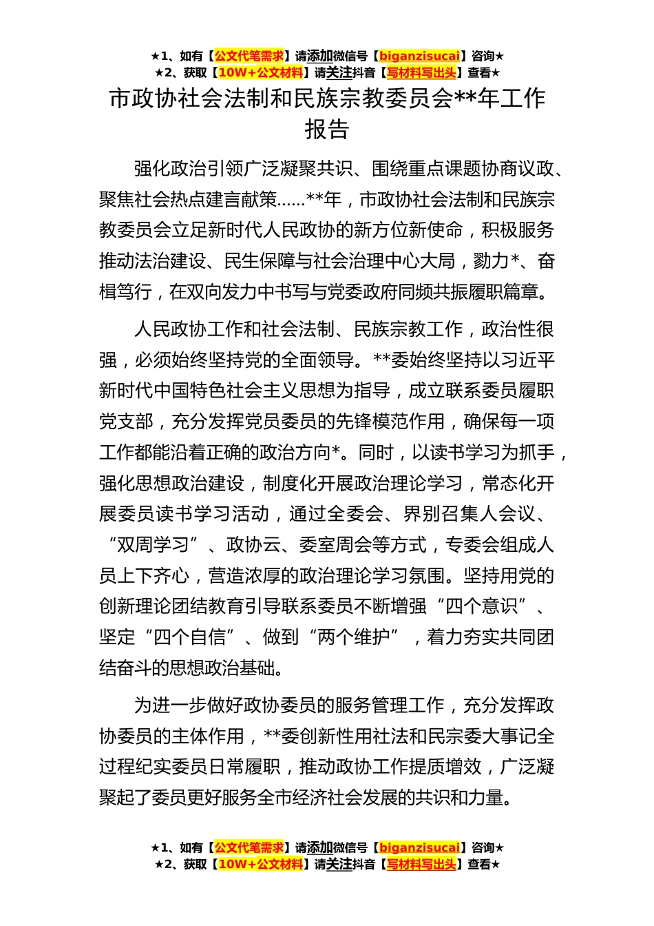 ★1、如有【公文代笔需求】请添加微信号【biganzisucai】咨询★★2、获取【10W+公文材料】请关注抖音【写材料写出头】查看★★1、如有【公文代笔需求】请添加微信号【biganzisucai】咨询★★2、获取【10W+公文材料】请关注抖音【写材料写出头】查看★★1、如有【公文代笔需求】请添加微信号【biganzisucai】咨询★★2、获取【10W+公文材料】请关注抖音【写材料写出头】查看★市政协社会法制和民族宗教委员会**年工作报告强化政治引领广泛凝聚共识、围绕重点课题协商议政、聚焦社会热点建言献策……**年,市政协社会法制和民族宗教委员会立足新时代人民政协的新方位新使命,积极服务推动法治建设、民生保障与社会治理中心大局,勠力*、奋楫笃行,在双向发力中书写与党委政府同频共振履职篇章。人民政协工作和社会法...